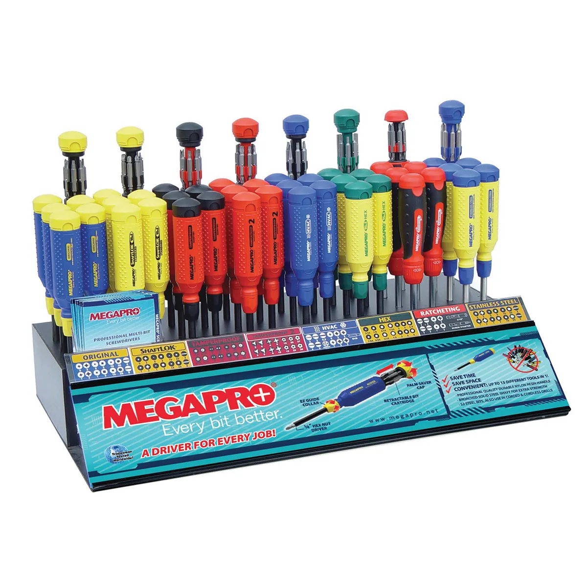 High-capacity display stand for 48 MegaPro drivers.