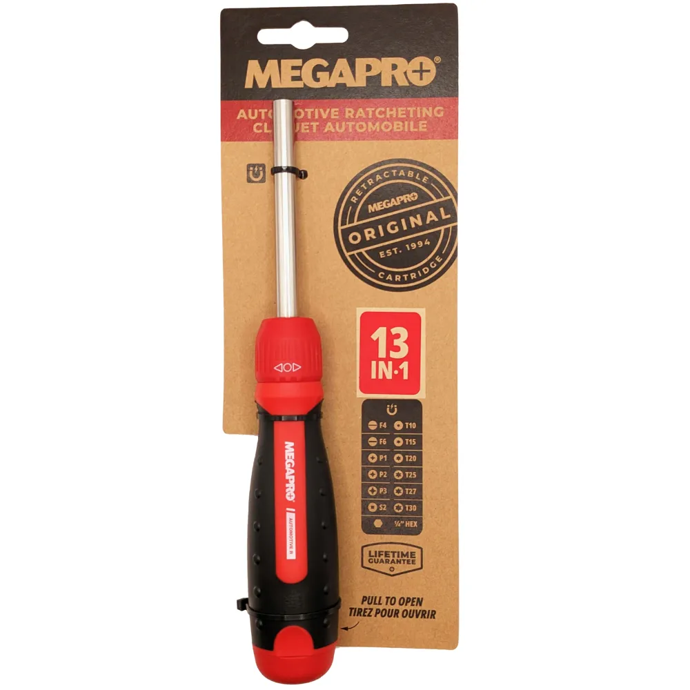 Ratcheting multi-bit screwdriver loaded with 12 single ended bits commonly used in the automotive industry. Patented zinc alloy solid-core mechanism that delivers more control and torque.