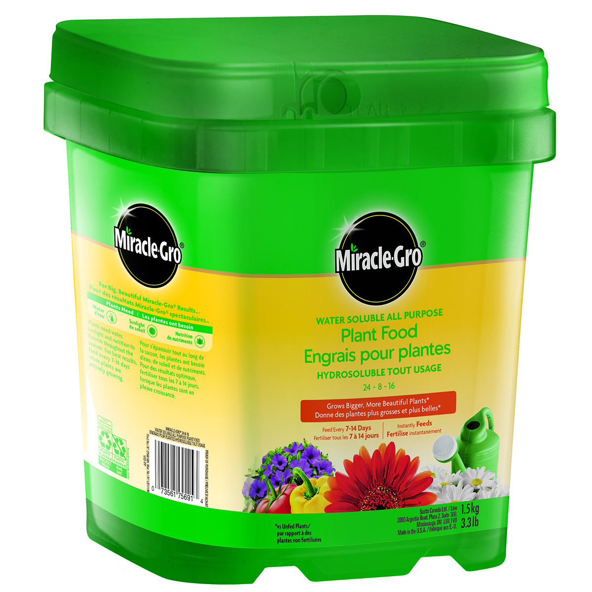 Keep all your plants healthy; happy; and well fed with Miracle-Gro® water soluble all purpose plant food 24-8-16. This is the all-purpose plant food that has it all: easy to use; works instantly; and provides quick; beautiful results. Works on all flowers; all vegetables; all trees; and all shrubs. Grows bigger; more beautiful plants. plus; Miracle-Gro® water soluble all purpose plant food 24-8-16 mixes up fast with just water. Feed with a watering can. Or; for even more convenience; use one packet and a garden hose with the one-handed Miracle-Gro® garden feeder.