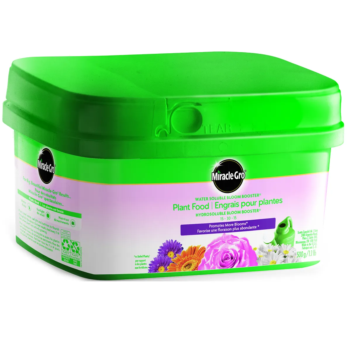 When it comes to plants and flowers; it's all about the flowers and foliage. For lots and lots of big; beautiful; colorful blossoms; feed your plants with Miracle-Gro water soluble bloom booster plant food 15-30-15. Promotes more blooms (vs unfed plants) on both indoor and outdoor plants. Mixes easily with water. Starts to work instantly; too. To use; apply with a watering can around the base of the plant until the soil is soaked. For even more convenient feeding on your outdoor plants; use with the Miracle-Gro Garden Feeder and a garden hose.