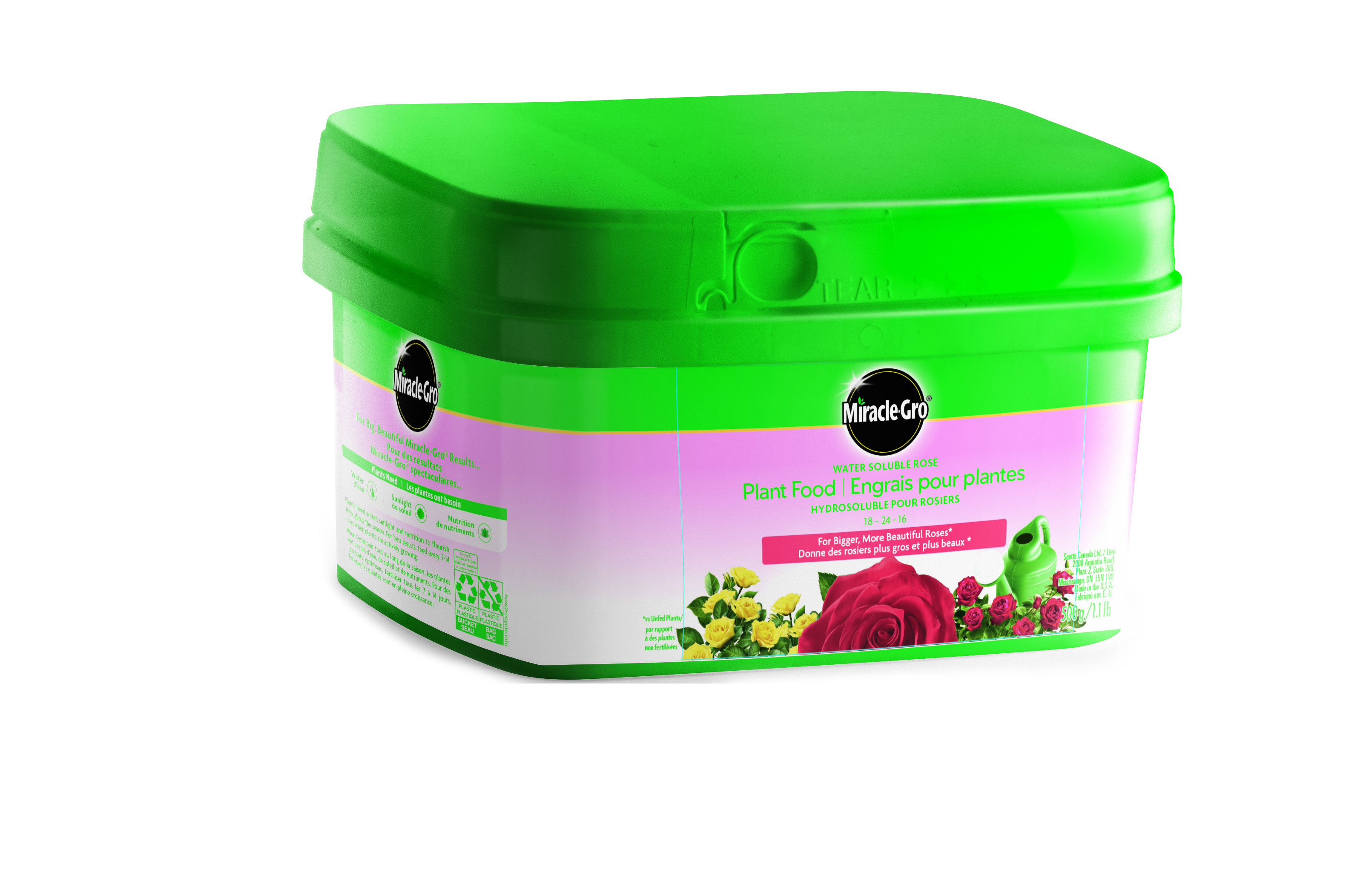 500 g (1.1 lb) feeds approximately 41 m2 (440 ft2 ) of garden area Tea roses; shrub roses or whatever you choose; you love your roses and Miracle-Gro does; too. For bigger; more beautiful roses (vs unfed plants); feed them with Miracle-Gro water soluble rose plant food 18-24-16. This plant food supports the growth of all roses; as well as plants that bloom again and again Feeds instantly while you water so gardening is fast and fuss-free. Show your rose plants some love: feed them regularly to help them thrive. Your roses and other blooming plants will return the love with big and bold; bright and beautiful blooms. Gotta love that.