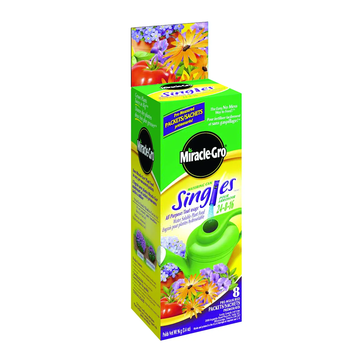 Great for indoor and outdoor flowers; vegetables; houseplants; roses; trees and shrubs Feeding plants is a good thing especially when its simple and speedy. Welcome to the quick; no-mess way to feed your plants: Miracle-Gro watering can singles all purpose water soluble plant food 24-8-16. No mixing required. No hassle involved. Grows Plants Twice as Big; too. To use; just tear open a packet; pour into a watering can; add water and feed. Helps all kinds of flowers and plants including vegetables and roses grow big and strong.