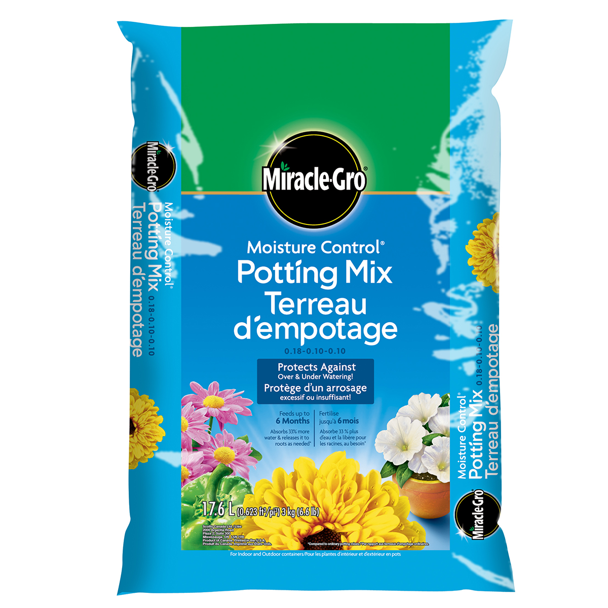 Now they can - with Miracle-Gro® Moisture Control® potting mix 0.18-0.10-0.10. This potting mix helps protect against overwatering and underwatering. That’s because it’s made with the exclusive AquaCoir® Formula. It’s the potting mix that absorbs 33% more water* and holds onto it; releasing it slowly and steadily only when roots need it. Plus; it contains Miracle-Gro® Plant Food to feed for up to 6 months.