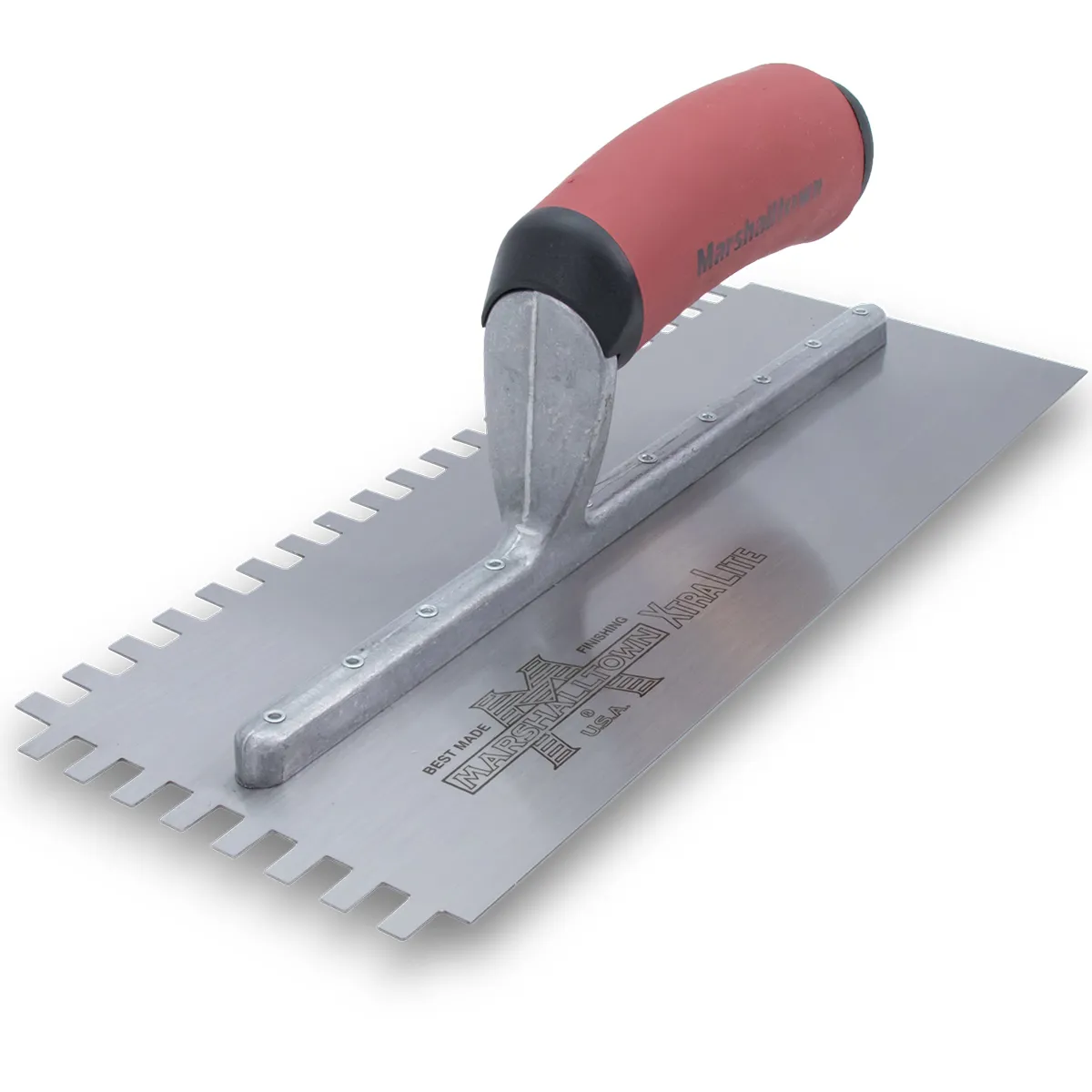 The MARSHALLTOWN Standard Notched Trowels are the best Tile Trowel for any professional tiler. These versatile Notched Trowels can be used to complete any and all types of tiling; from floors; walls; or a kitchen backsplash to the most intricate mosaic work. Each of our 11in x 4 ½in Notched Trowels have an aluminum alloy mounting riveted to a hard tempered steel blade that is flexible yet durable. MARSHALLTOWN offers four notch shape options: Square; U-Shape; V-Shape; or the deep U-notched Elliptical. You can also choose the best notch size and handle material to fit your needs. Choose between a soft grip DuraSoft®; curved hardwood; or straight hardwood handle angled for either right or left-handed use. All variants of this notched trowel are Made in the USA with Global Materials.