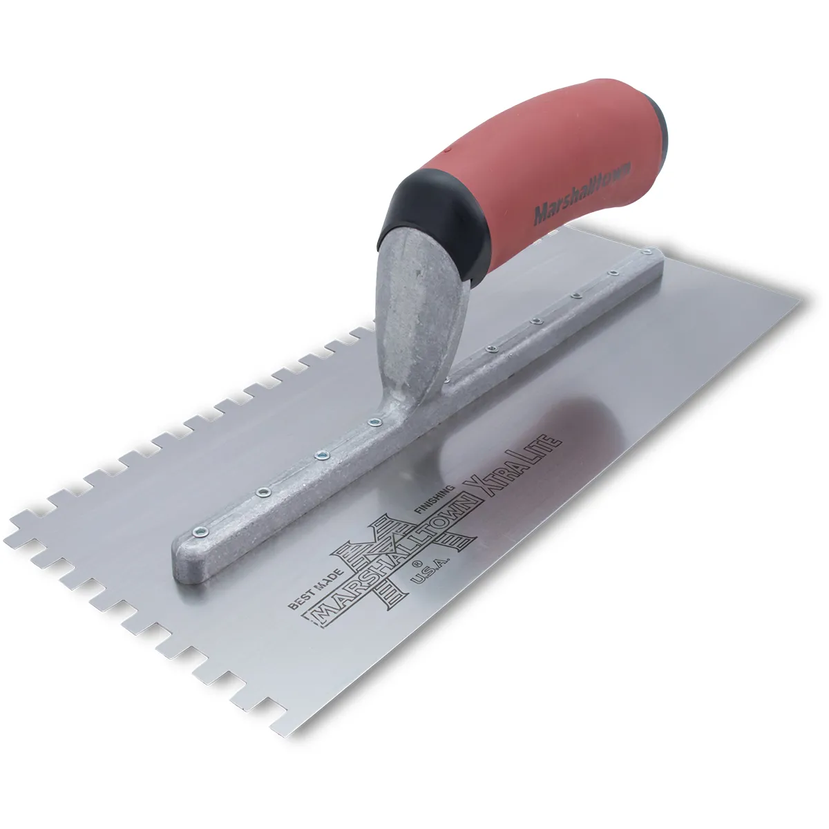 The MARSHALLTOWN Standard Notched Trowels are the best Tile Trowel for any professional tiler. These versatile Notched Trowels can be used to complete any and all types of tiling; from floors; walls; or a kitchen backsplash to the most intricate mosaic work. Each of our 11in x 4 ½in Notched Trowels have an aluminum alloy mounting riveted to a hard tempered steel blade that is flexible yet durable. MARSHALLTOWN offers four notch shape options: Square; U-Shape; V-Shape; or the deep U-notched Elliptical. You can also choose the best notch size and handle material to fit your needs. Choose between a soft grip DuraSoft®; curved hardwood; or straight hardwood handle angled for either right or left-handed use. All variants of this notched trowel are Made in the USA with Global Materials.
