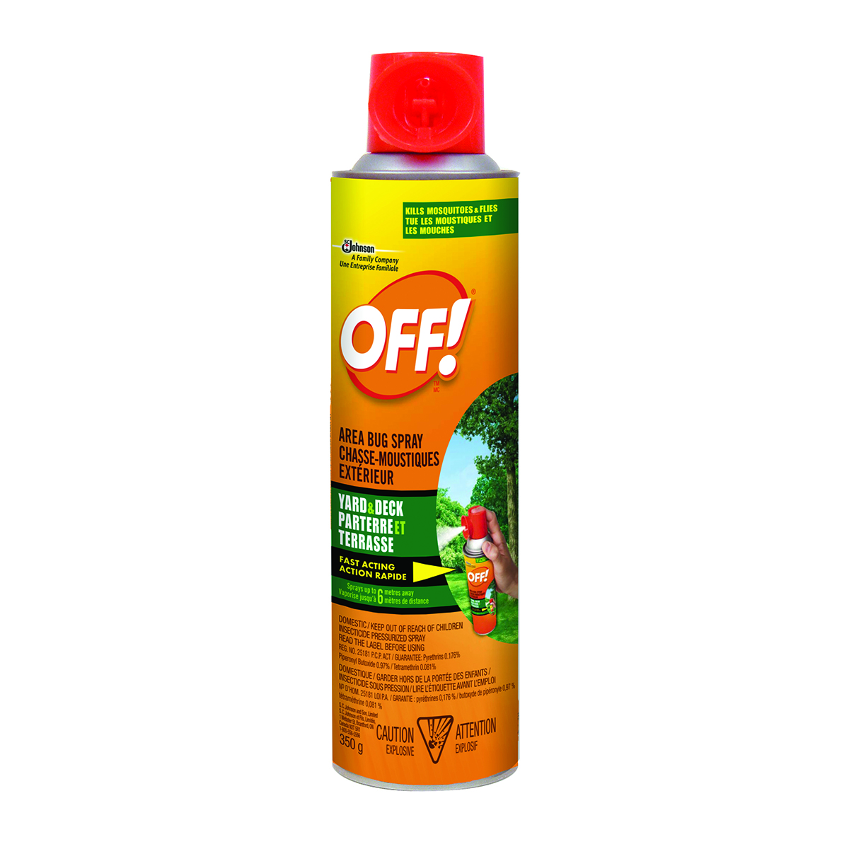 OFF!® Area bug spray (Yard & Deck) provides a fogging action over a large area and kills flies; mosquitoes; wasps and hornets. This fast-acting product is for use in areas including backyards; patios; decks and garages.