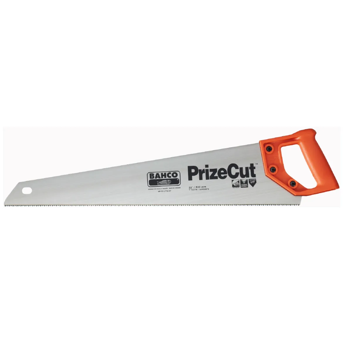 Handsaw for cutting all types of wood universal toothing with hardpoint teeth for long lasting sharpness screwed 1-piece plastic handle.