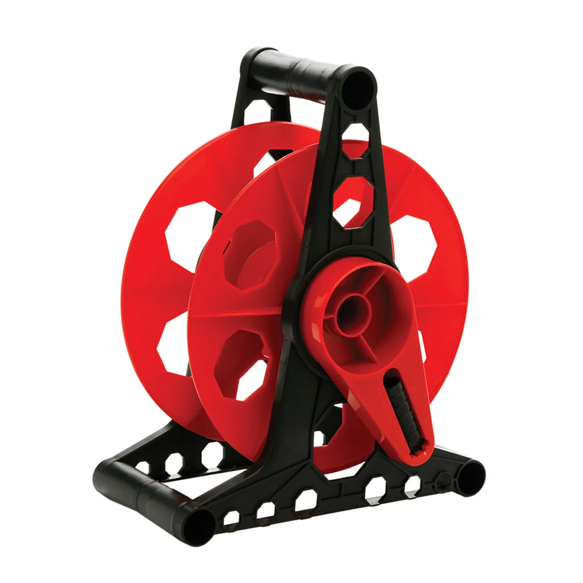150 ft Pro Electrical Cord Reel is Tangle free cord storage for both outdoor and indoor use Side-mounted handle allows you to quickly wind and unwind cords. Heavy duty plastic construction. Holds up to 150 ft. of 16/3 gauge cord or up to 125 ft. of 14/3 gauge cord.