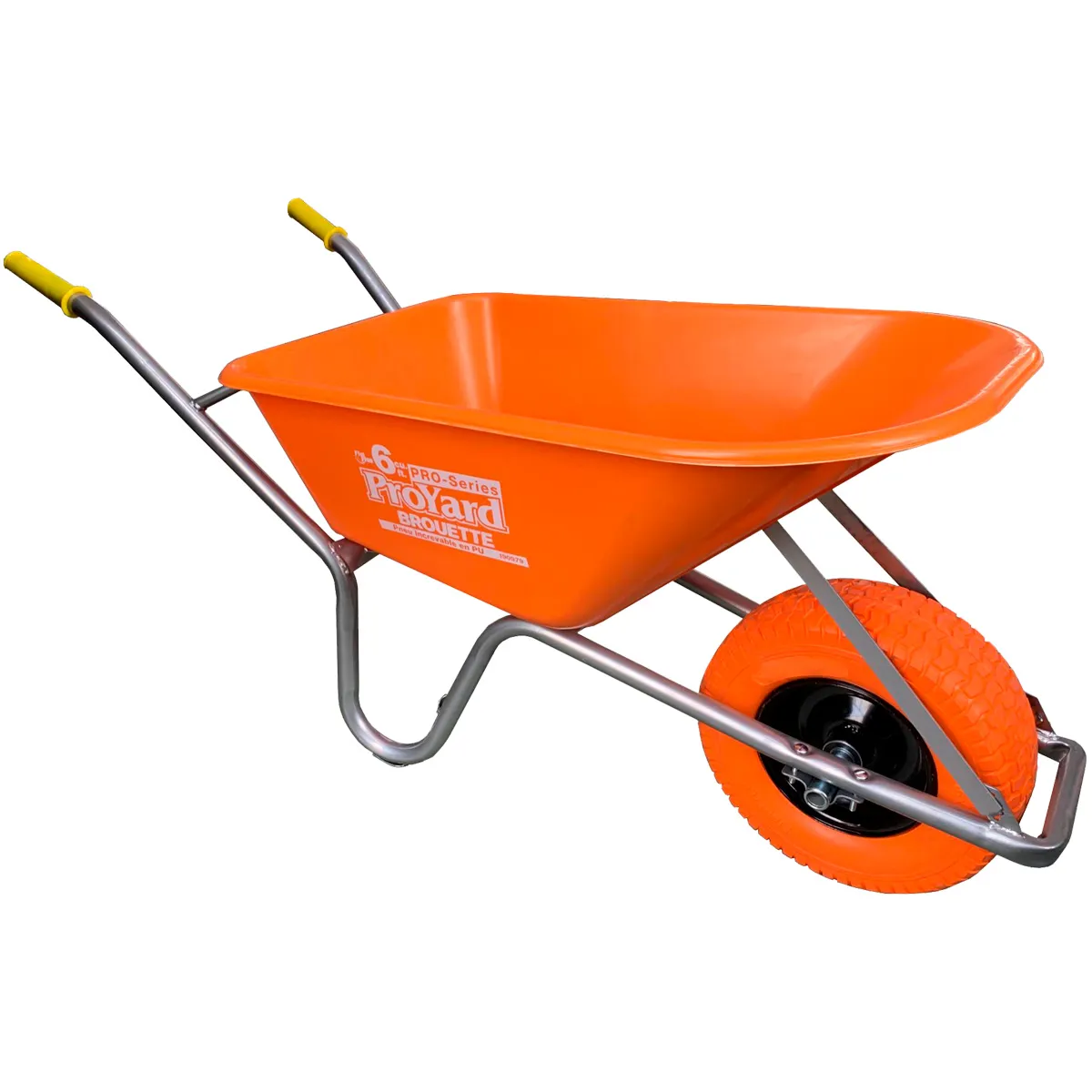 The Pro-Series Landscape wheelbarrow is designed for the toughest of conditions. Can be used in Landscaping, construction and agriculture. Features a large 6 cu.ft poly tray with rolled rim. The tubular one piece heavy duty powder coated steel frame has cushion grip handles for added comfort and hand protection. Large extra-wide 16" tire is flat-free and will never puncture.