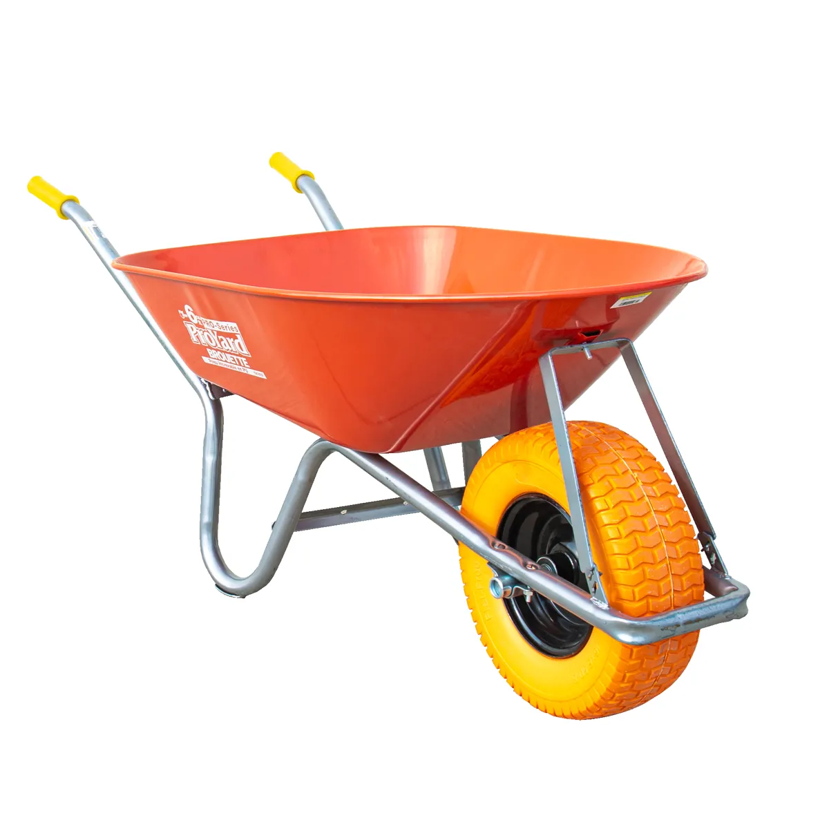 The Pro-Series Landscape wheelbarrow is designed for the toughest of conditions. Can be used in Landscaping, construction and agriculture. Features a large 6 cu.ft bolt-less Steel tray with rolled rim and narrow front spout. The tubular one piece heavy duty powder coated steel frame has cushion grip handles for added comfort and hand protection. Large extra-wide 16" tires are flat-free and will never puncture.