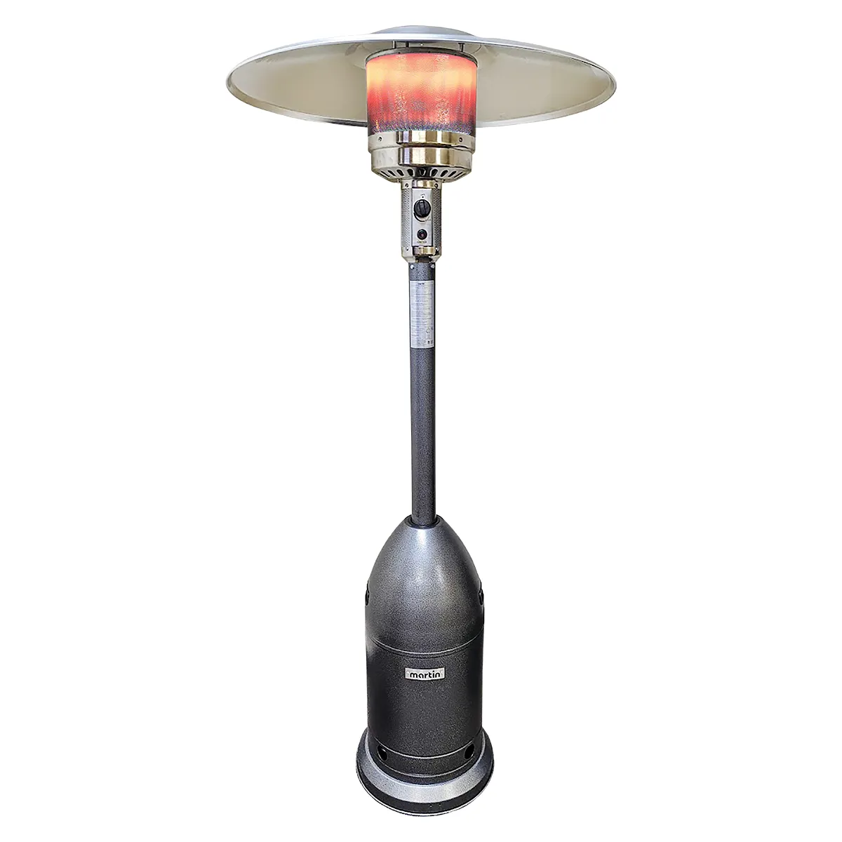 Patio heater with electronic starter. Safety tilt switch will shut off gas if heater leans or tilts to an unsafe angle. Will operate up to 20 hours from a common 20lb propane tank.