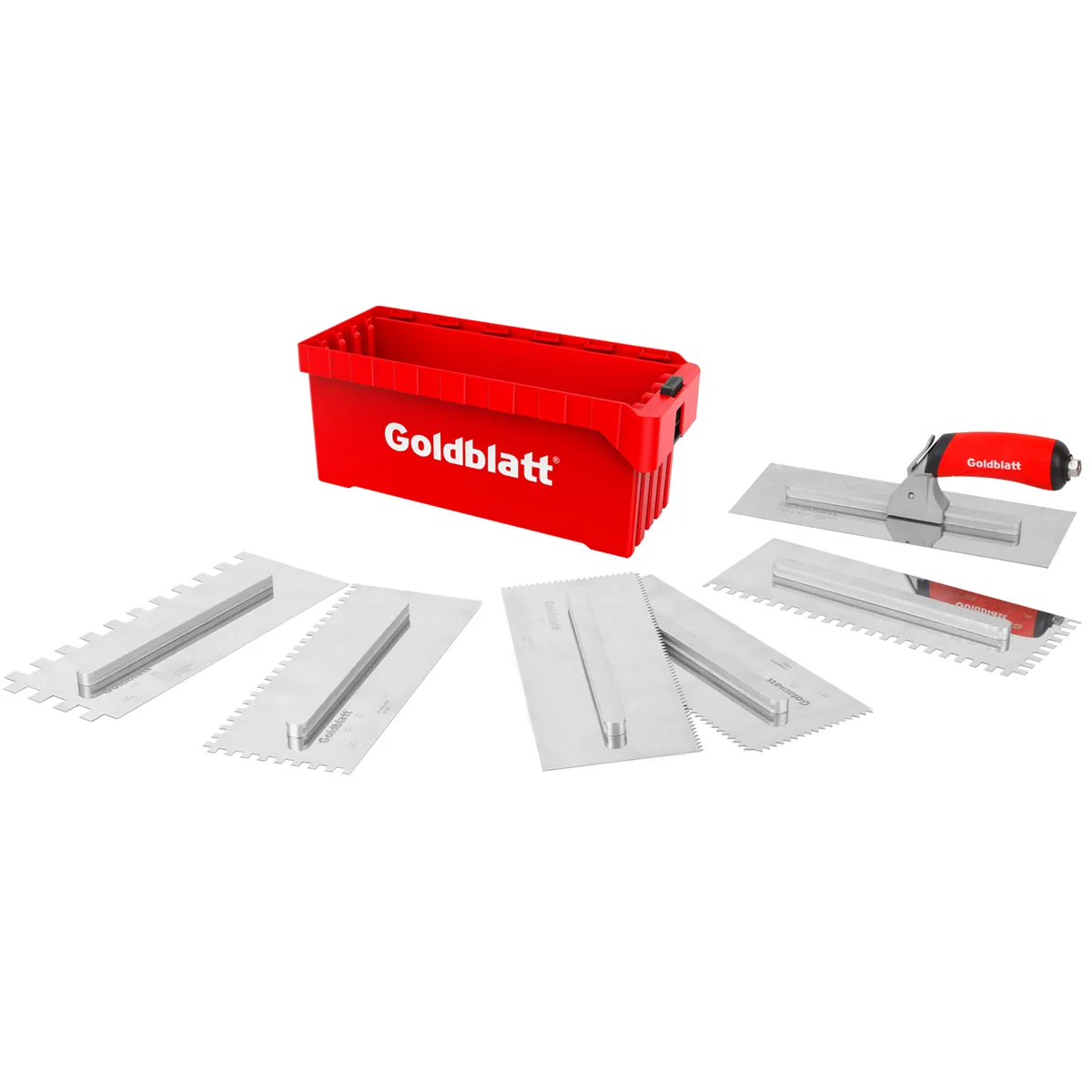 6-Piece Stainless Steel Trowel Blades: SQ 1/4" x 1/4" x 1/4" | SQ 1/4" x 3/8" x 1/4"| SQ 1/4" x 3/8" x 1/4" | SQ 1/2" x 1/2" x 1/2" | V 3/16" x 5/32" | V 1/4" x 3/16" | Finishing Trowel 11" x 4.5".