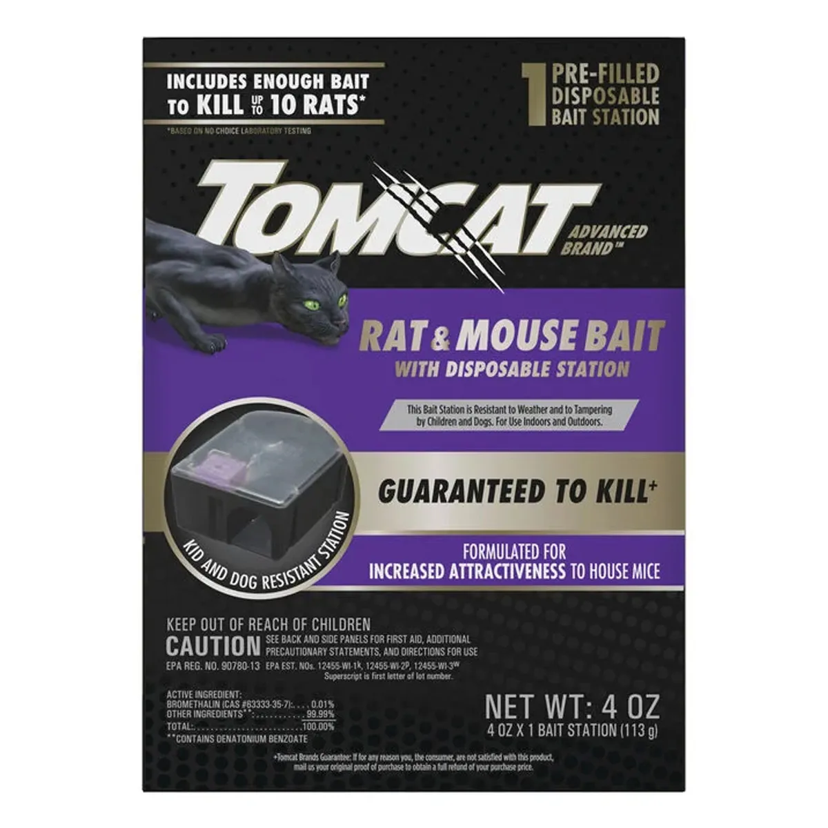 • Tomcat Advanced Brand™ Rat & Mouse Bait with Disposable Station kills rats and mice both indoors and outdoors with bait that is formulated for increased attractiveness to house mice.