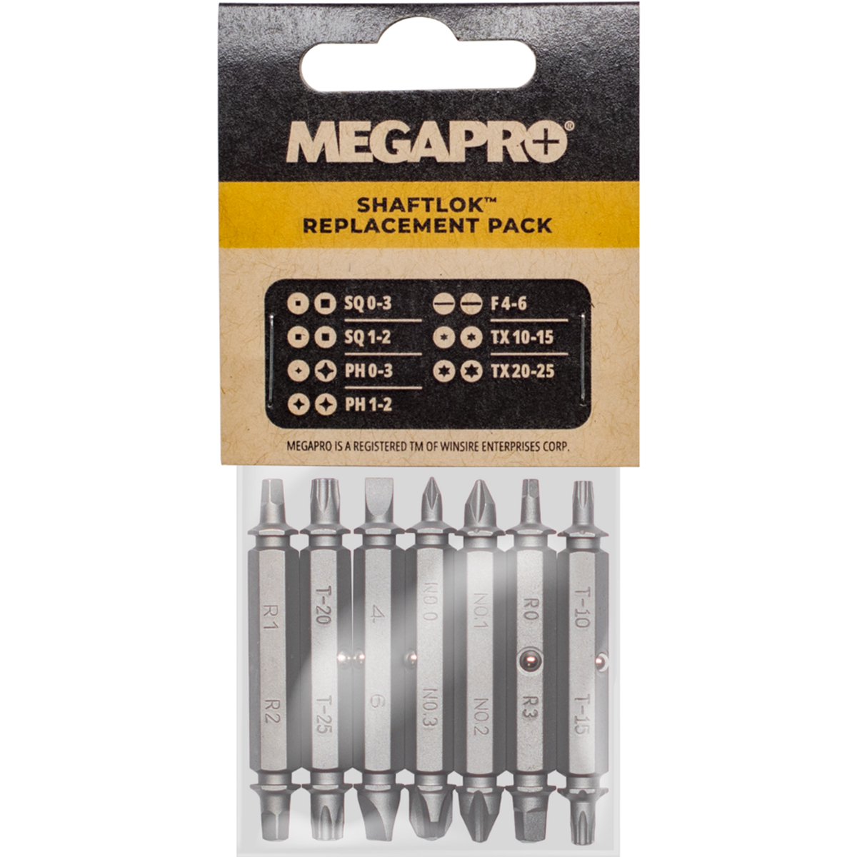 Replacement bit set includes: flat (slot) shaftlok bit 4-6 | phillips shaftlok bit 0-3 | phillips shaftlok bit 1-2 | square (robertson) shaftlok bit 0-3 | square (robertson) shaftlok bit 1-2 | star (torx) shaftlok bit 10-15 | star (torx) shaftlok bit 20-25.