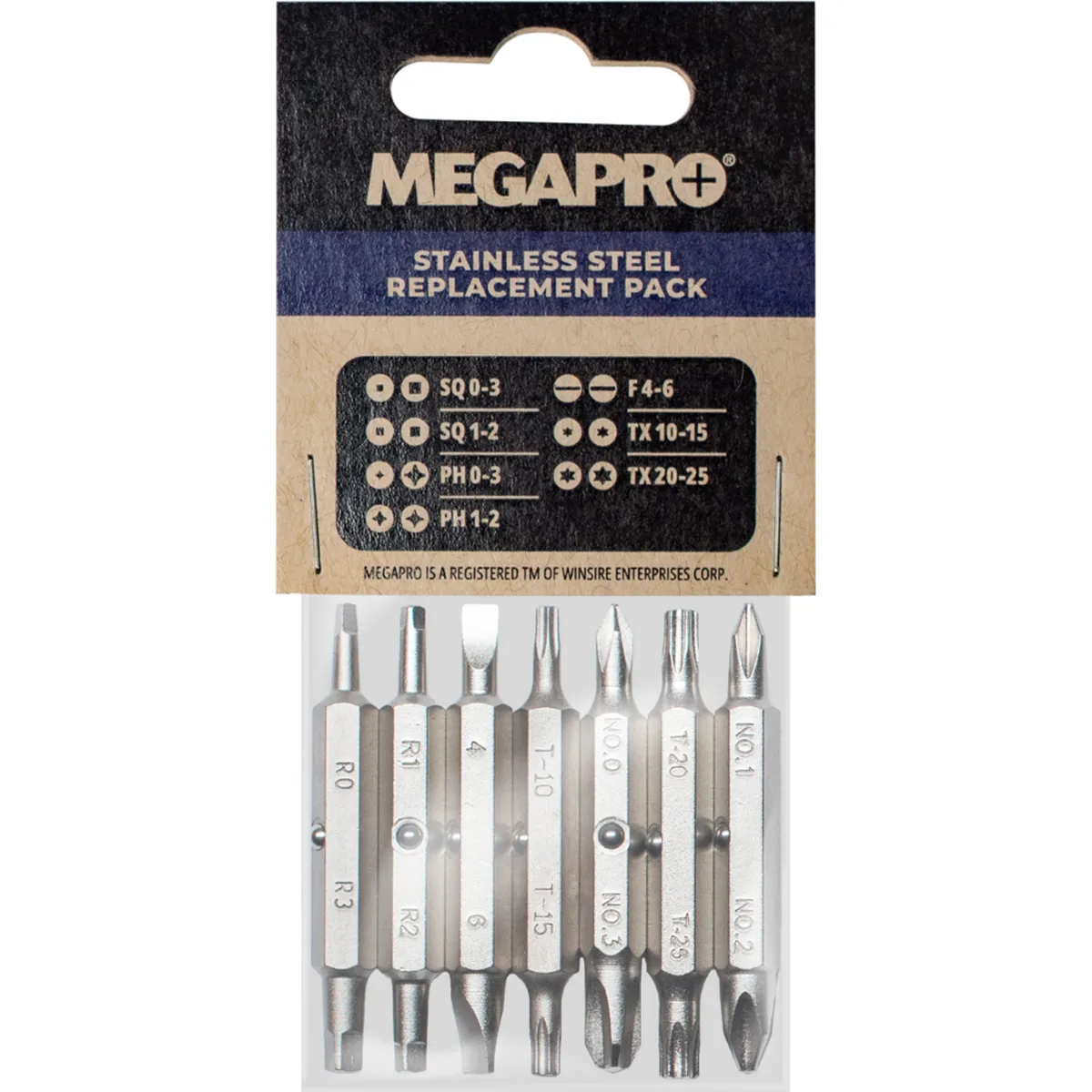 Replacement Bit set includes: Square (Robertson) Bit 0-3 ENP | Square (Robertson) Bit 1-2 ENP | Phillips Bit 0-3 ENP | Phillips Bit 1-2 ENP | Flat (Slot) Bit 4-6 ENP | Star (Torx) Bit 10-15 ENP | Star (Torx) Bit 20-25 ENP.