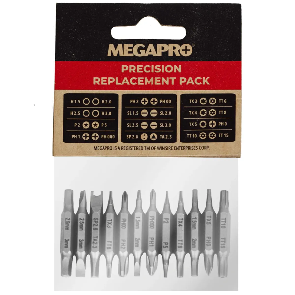 • Replacement Bit set includes: Hex 1.5-2.00mm | Hex 2.5-3.0mm | Pentalobe 2-5 | Phillips 1-000 | Phillips 2-00 | Flat 1.5-2.0 | Flat 2.5-3.0 | Spanner 2.6-Triangle 2.3 | Torx 3-Torx Pin 6 | Torx 4-Torx Pin 8 | Torx 5-Phillips 0 | Torx Pin 10-15.