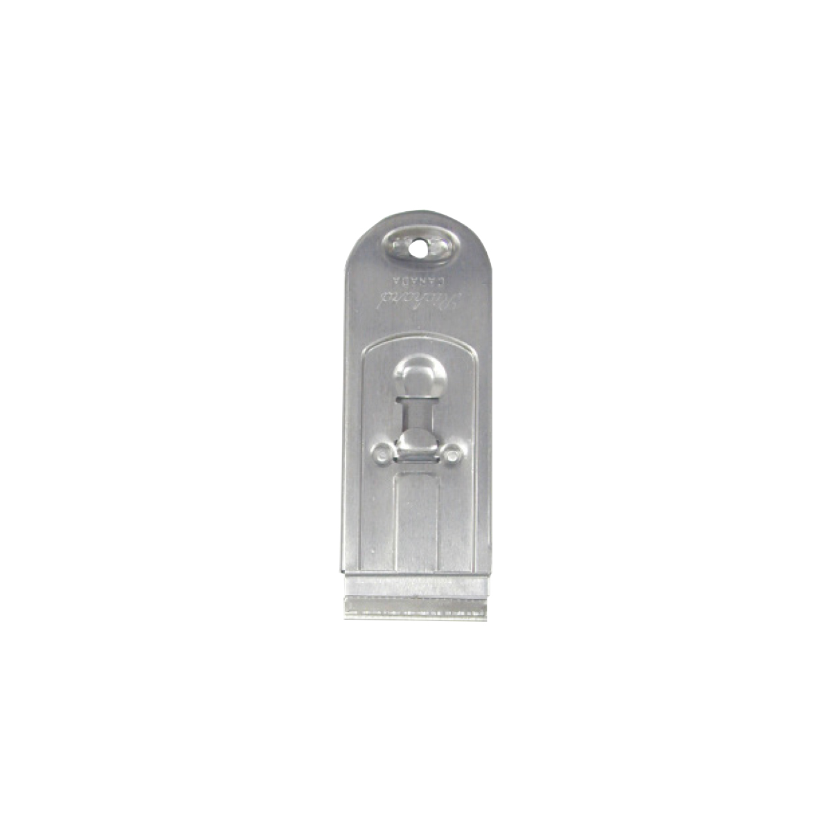 Retractable metal razor scraper with single-edge blade; positive locking system. Scrapes and cleans windows and various glass surfaces.