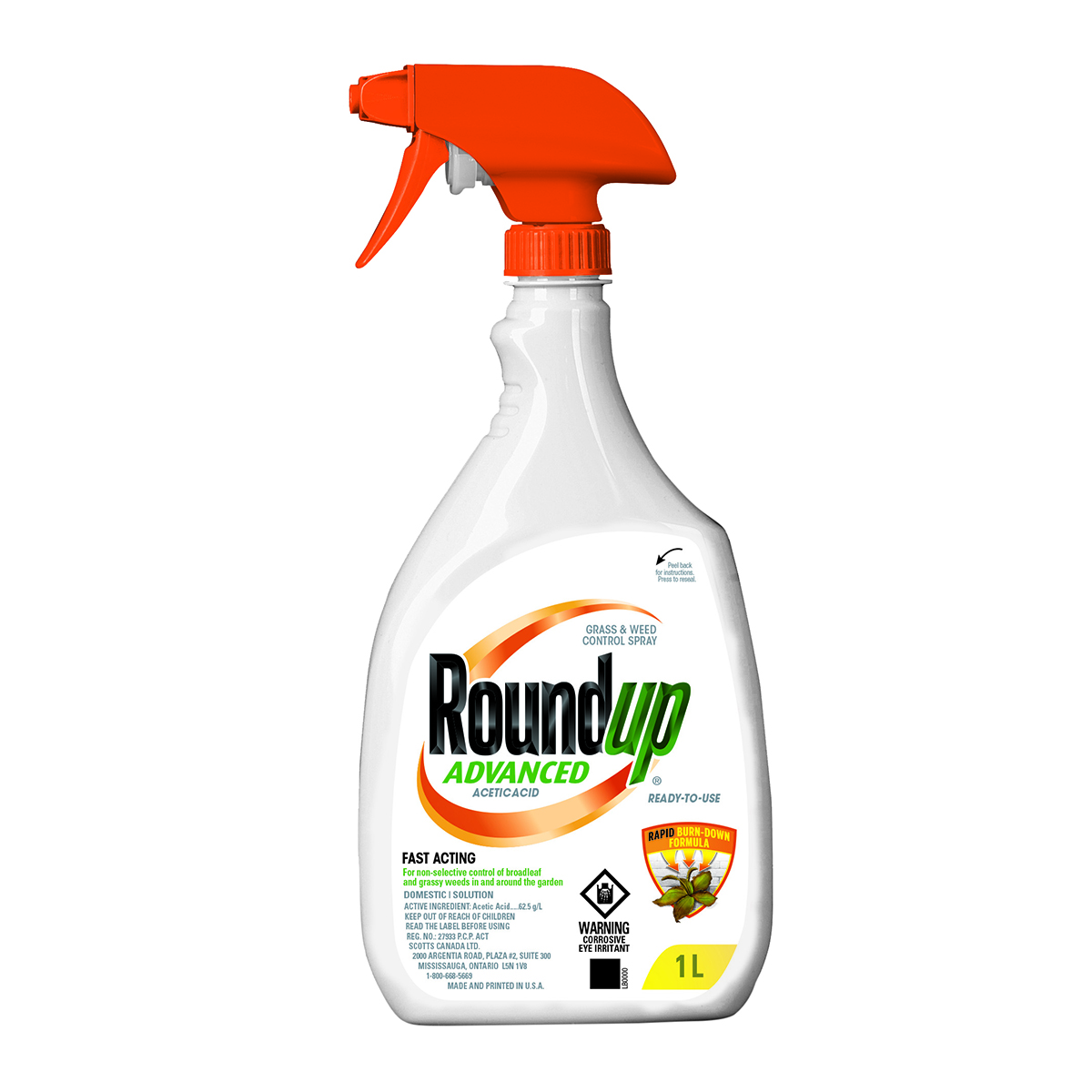 Primary Ingredient: acetic acid 62.5 g/L Roundup advanced ready-to-Use is an effective way to control unwanted weeds and grasses. This convenient format is perfect for spot control of weeds in and around gardens and on walkways; patios; driveways and around structures. Saturate unwanted plants and you'll see visible effects after spraying due to a rapid burndown acetic acid formula. Actively growing; susceptible broadleaf and grassy weeds are controlled in 1 to 2 days. This spray controls unwanted grasses; annual weeds like common ragweed and the top growth of perennial weeds such as plantain; plus it won't leave harmful residues in the soil.