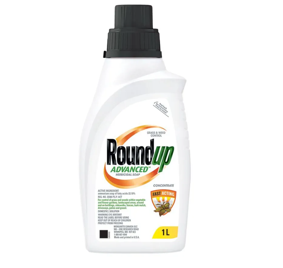 Roundup Advanced® Concentrate has a fast-acting formula that kills many common annual weeds. Within hours; Roundup Advanced® Concentrate starts to kill the weed; plant damage will be visible from a few hours to 2 days after spraying. Roundup Advanced® Concentrate contains the active ingredient ammonium soap of fatty acids; which is a contact; non-selective; foliar-applied herbicide. Ammonium soap of fatty acids is a non-selective herbicide; which means that it controls many common weeds and grass.