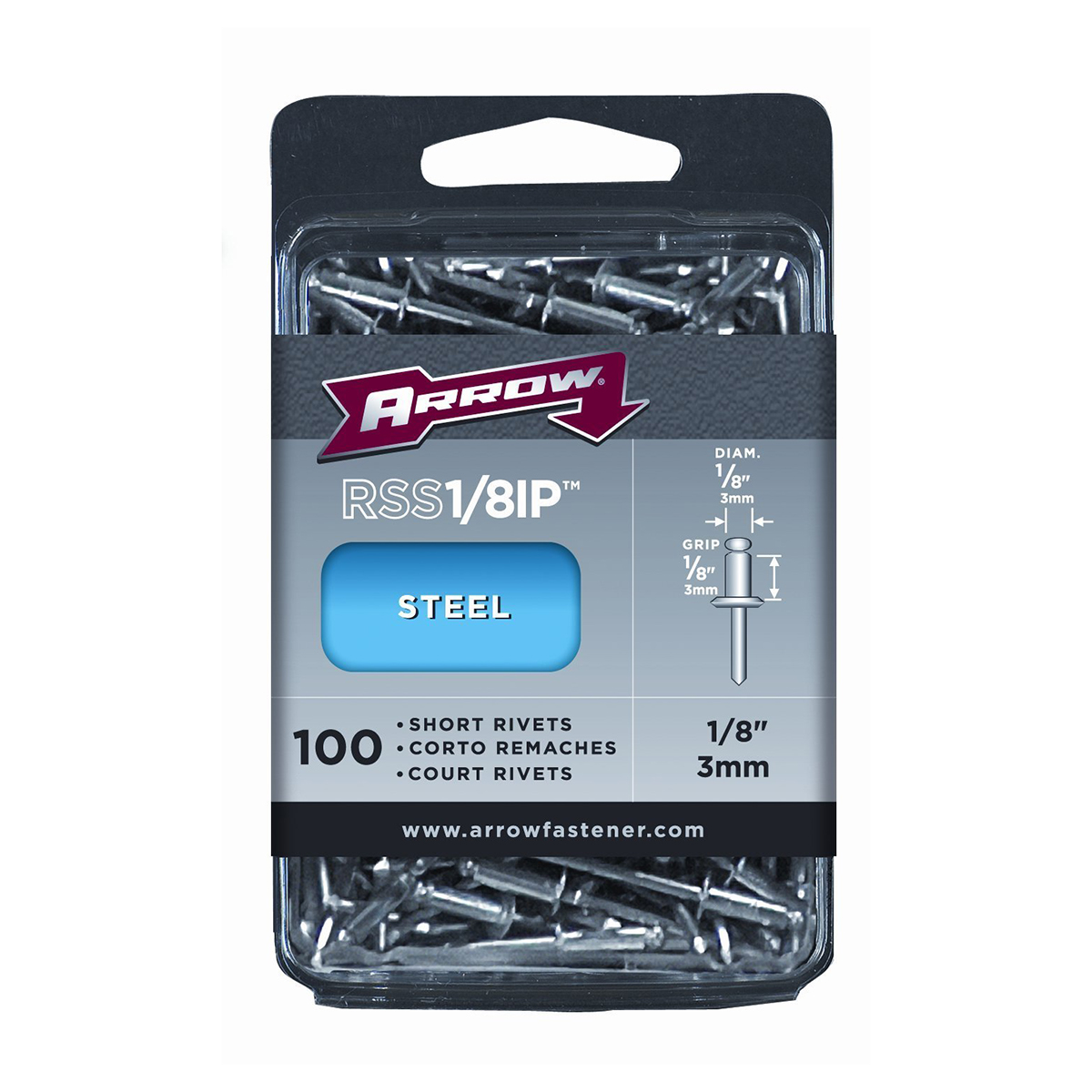 Rivets steel package; 1/8 inch grip range; pack of 25 Use steel rivets for very heavy duty jobs and when riveting steel to steel. Use aluminum rivets for lighter weight jobs and materials such as aluminum; fabrics; plastics; leather; etc. Use washers when joining soft materials or when existing hole is oversize.