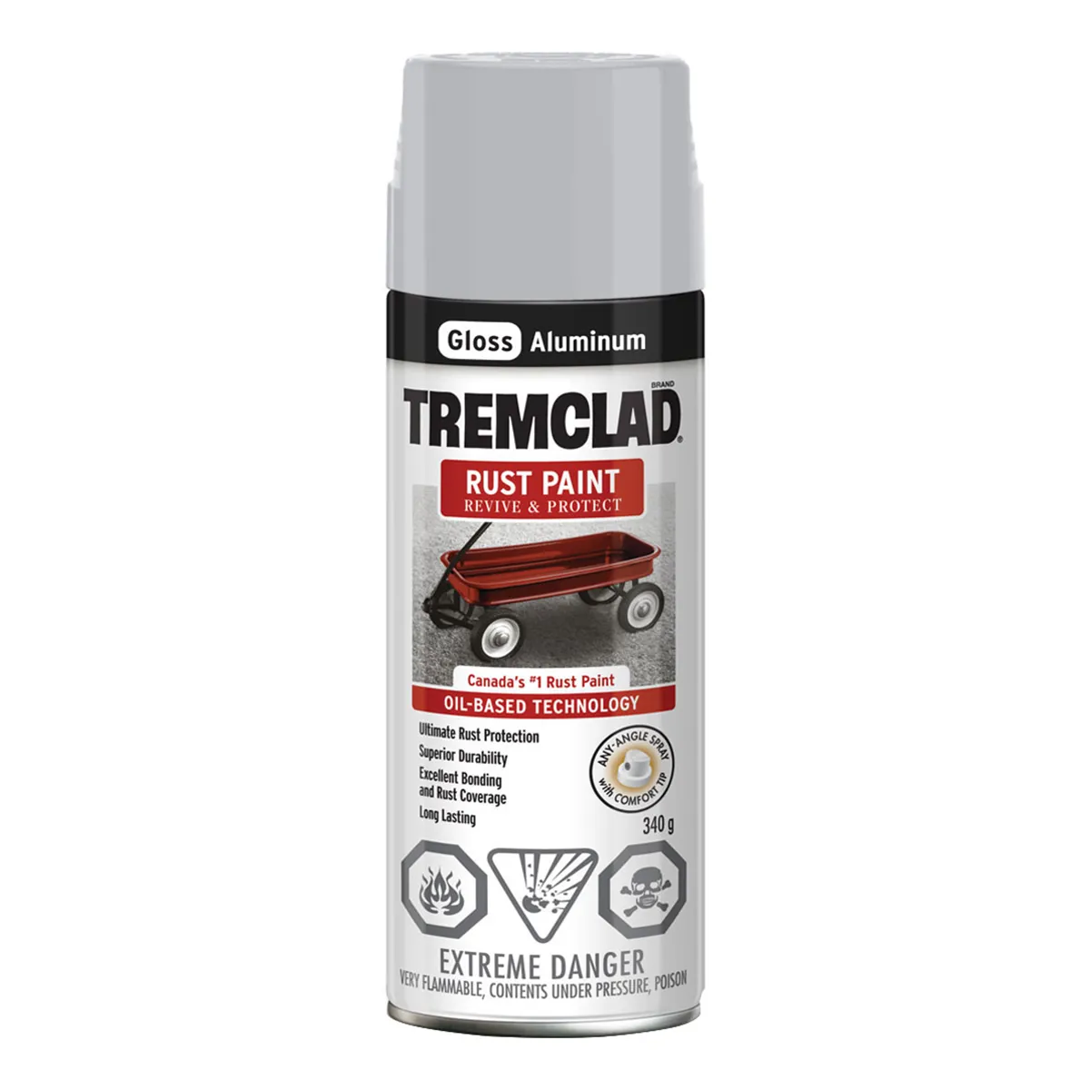 TREMCLAD® Oil-Based Rust Paint Spray offers superior rust inhibition and is specially formulated to penetrate rust and bind to metal. Comfort spray tip with a wide finger pad prevents finger fatigue while providing excellent spray control. Any-angle spray feature even sprays upside down for hard-to-reach areas.