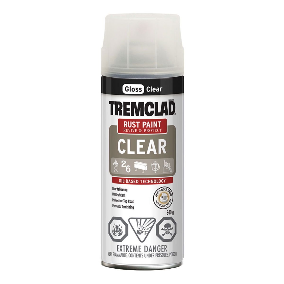 TREMCLAD® Oil-Based Rust Paint Spray offers superior rust inhibition and is specially formulated to penetrate rust and bind to metal. Comfort spray tip with a wide finger pad prevents finger fatigue while providing excellent spray control. Any-angle spray feature even sprays upside down for hard-to-reach areas.