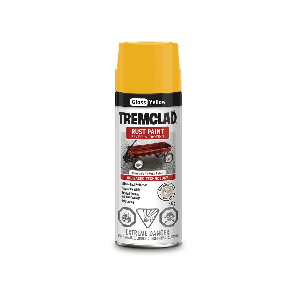 TREMCLAD® Oil-Based Rust Paint Spray offers superior rust inhibition and is specially formulated to penetrate rust and bind to metal. Comfort spray tip with a wide finger pad prevents finger fatigue while providing excellent spray control. Any-angle spray feature even sprays upside down for hard-to-reach areas.