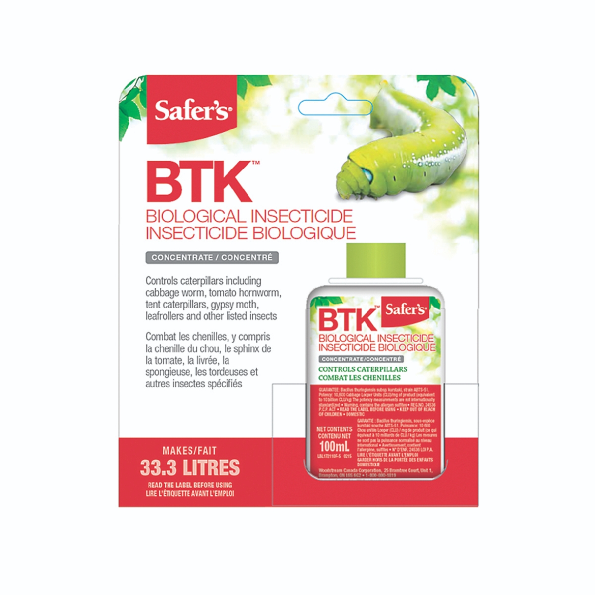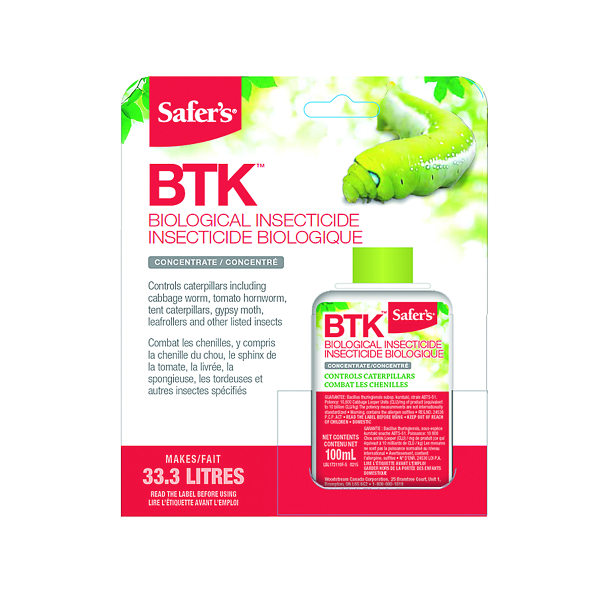 Safer’s BTK Caterpillar Killer is a biological insecticide that controls caterpillars including cabbage worm, tomato hornworm, tent caterpillars, gypsy moth, leafrollers, and other listed insects. Simply mix the concentrate with water and spray on vegetables, fruit, trees, and ornamentals. After ingesting the treated portion of the leaf, caterpillars stop feeding within hours and die within a few days. This 100mL concentrate makes 33.3L of solution.