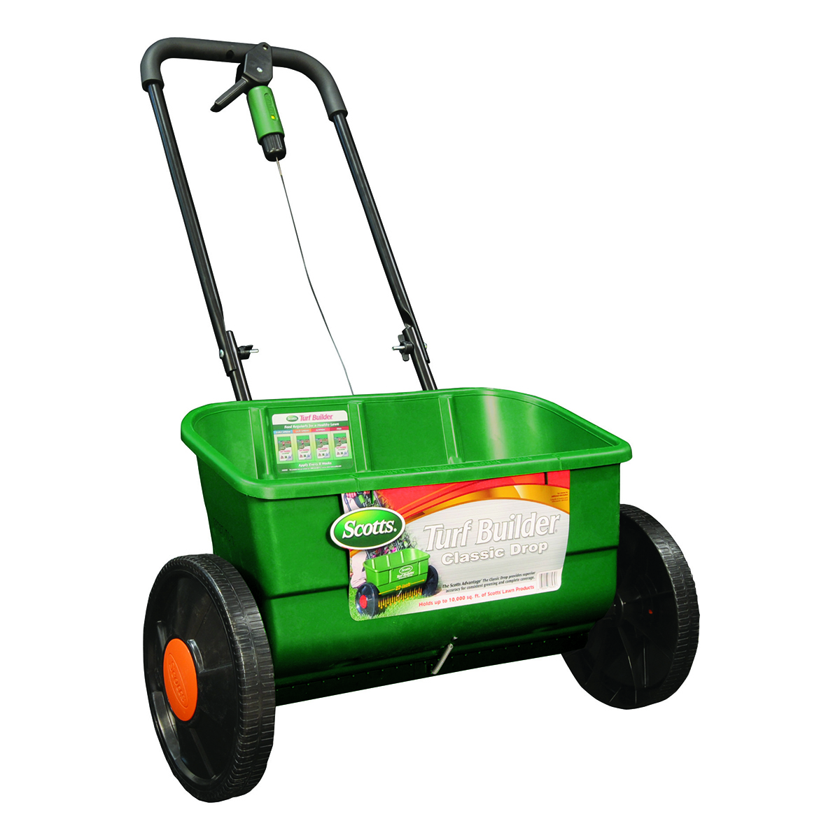Use the Scotts Turf Builder Classic Drop Spreader to apply grass seed and fertilizer in spring; summer or fall. The large hopper holds up to 10;000 sq. ft. of Scotts Lawn Care Products and is fully assembled. Spreaders provide uniform coverage of granular products year-round. Without one; you may end up with an uneven application of fertilizer or control products that can result in an uneven feeding and weed; disease or insect control.