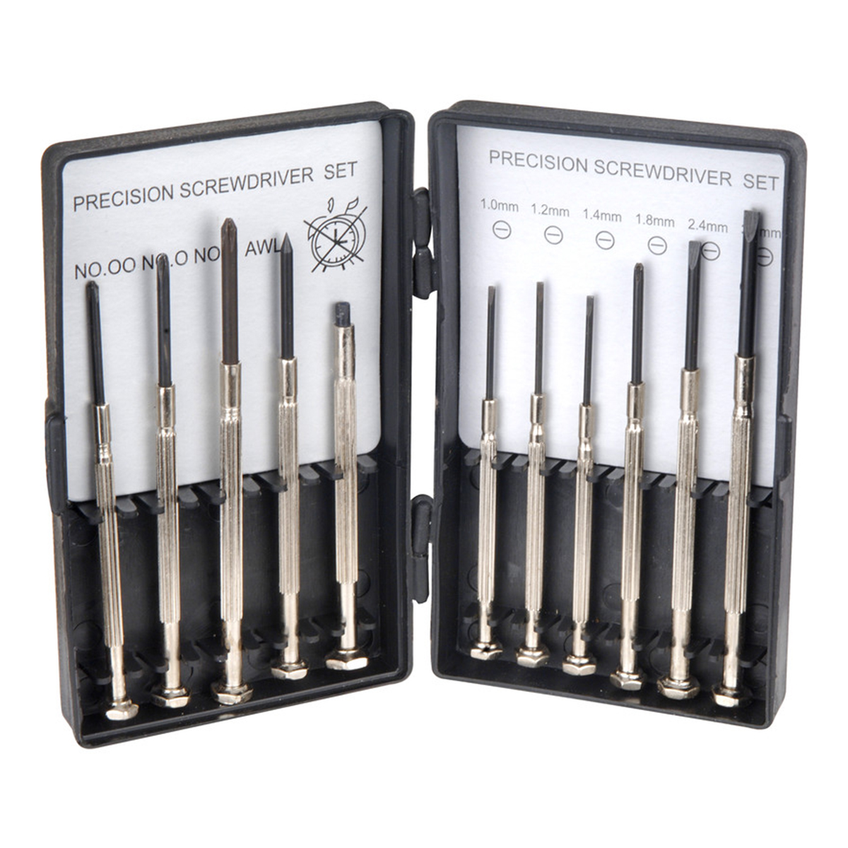 Set includes: (6) Slotted: 0.1mm; 1.2mm; 1.4mm; 1.8mm; 2.4mm; 3.0mm | (3) Phillips: PH00; PH0; PH1 | (1) Awl | (1) Magnetic tip.