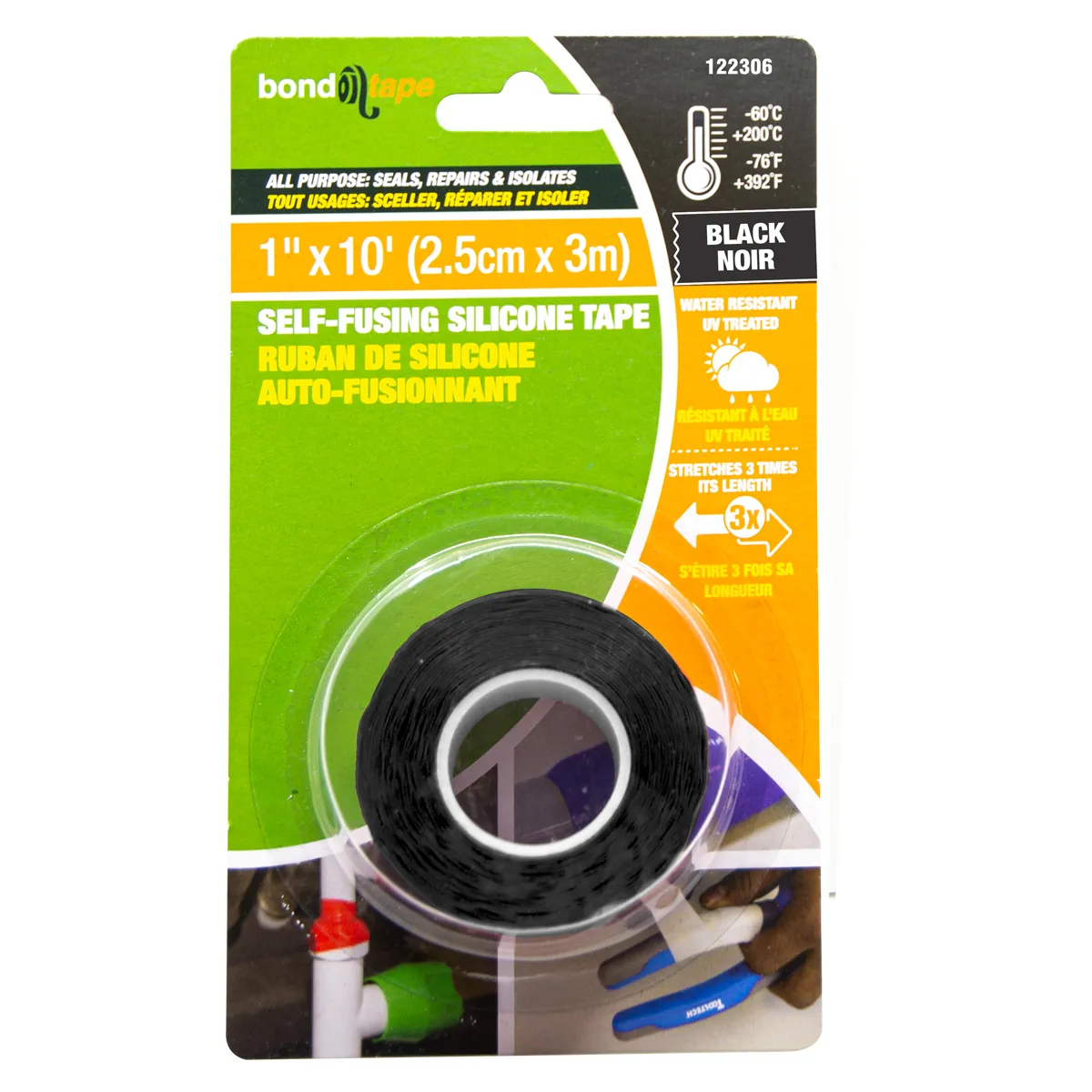 • Self-Fusing Silicone Tape is water retardant/or auto repair; electrical wiring; watercraft; plumbing and general repair.