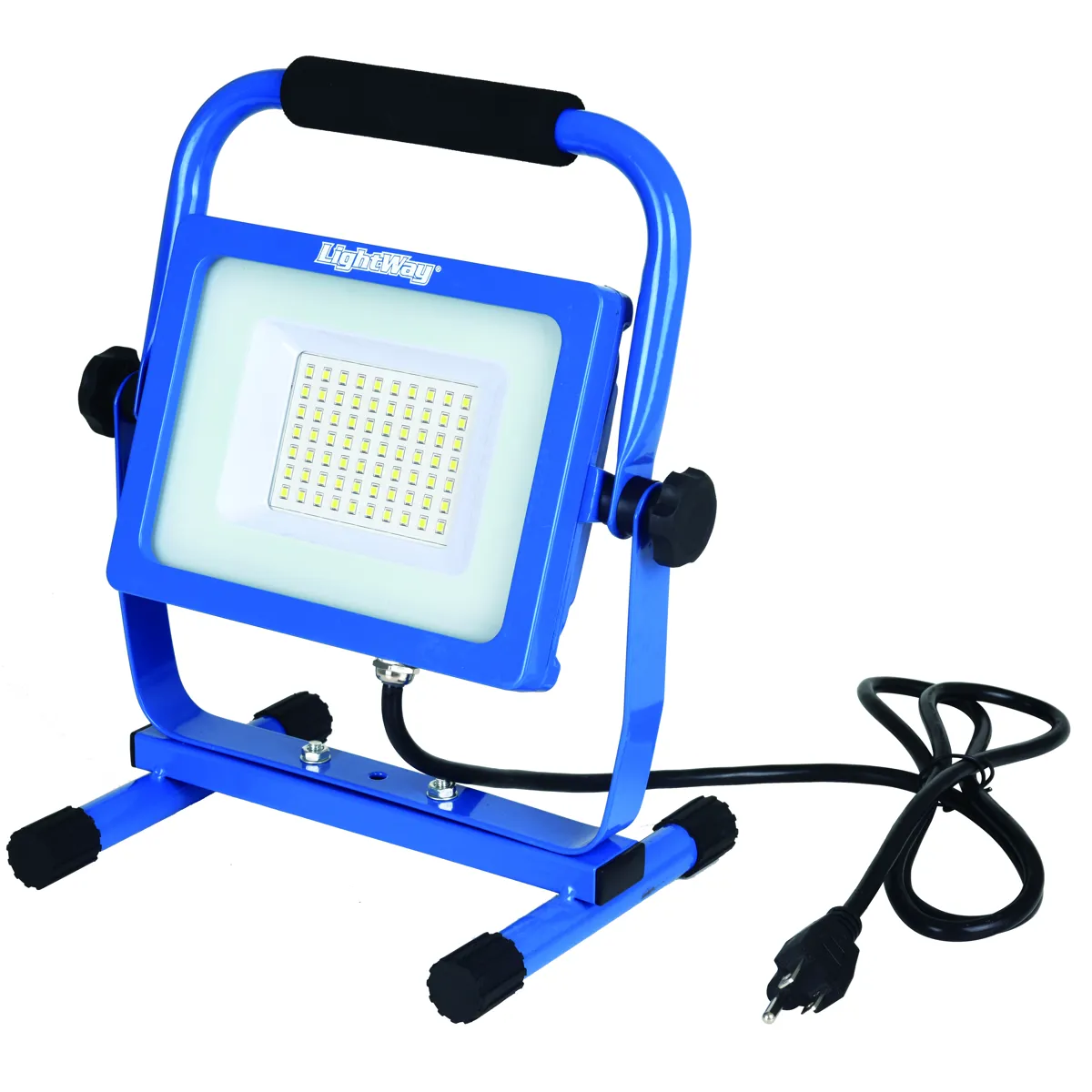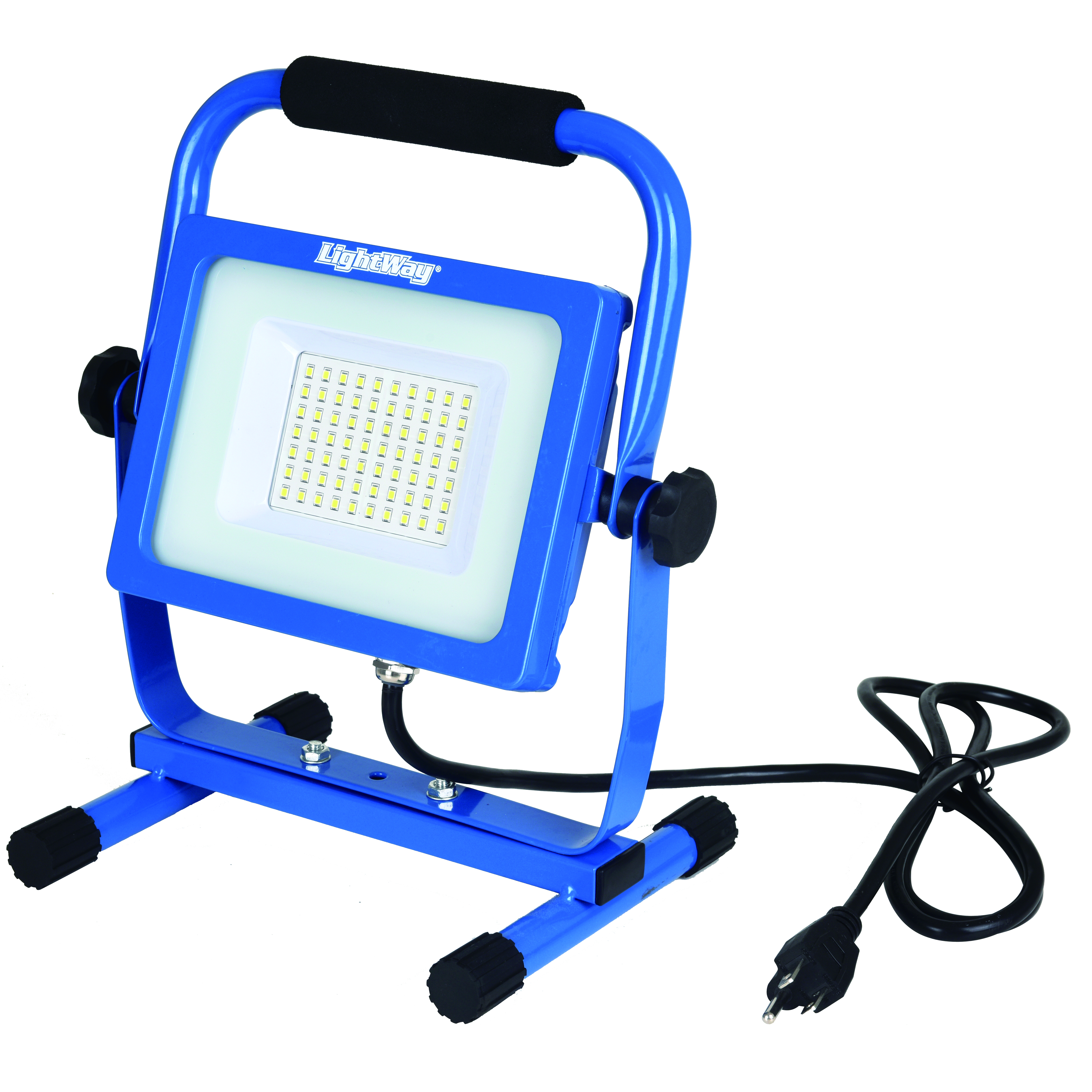 The Lightway integrated LED work light uses SMD technology to produce an exceptionally bright high-powered beam. SMD spotlights offer higher lumen output with lower energy consumption; making them more powerful and energy efficient than older first-generation LEDs. This small portable light uses 52W to produce 5000 lumens allowing you to illuminate even the darkest working environments. The included 'H'-stand with rubber feet quickly attaches and provides stable and secure placement when positioned on a variety of surfaces. The work light comes with a 5ft (1.5m) thermoplastic cord (SJTW-18/3); that is rated for 120V and approved for outdoor usage. Perfect for painters; general contractors; or homeowners.