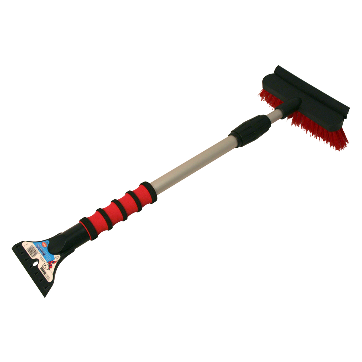 Snow Brush Telescopic Handle with Ice Scraper Extends from 23 inches to 36 inches. 7-inch dual head with rubber squeegee and durable bristle brush. About 4 inches of ice scraper on the other end. Has a foam grip for a comfortable brush or scrape.
