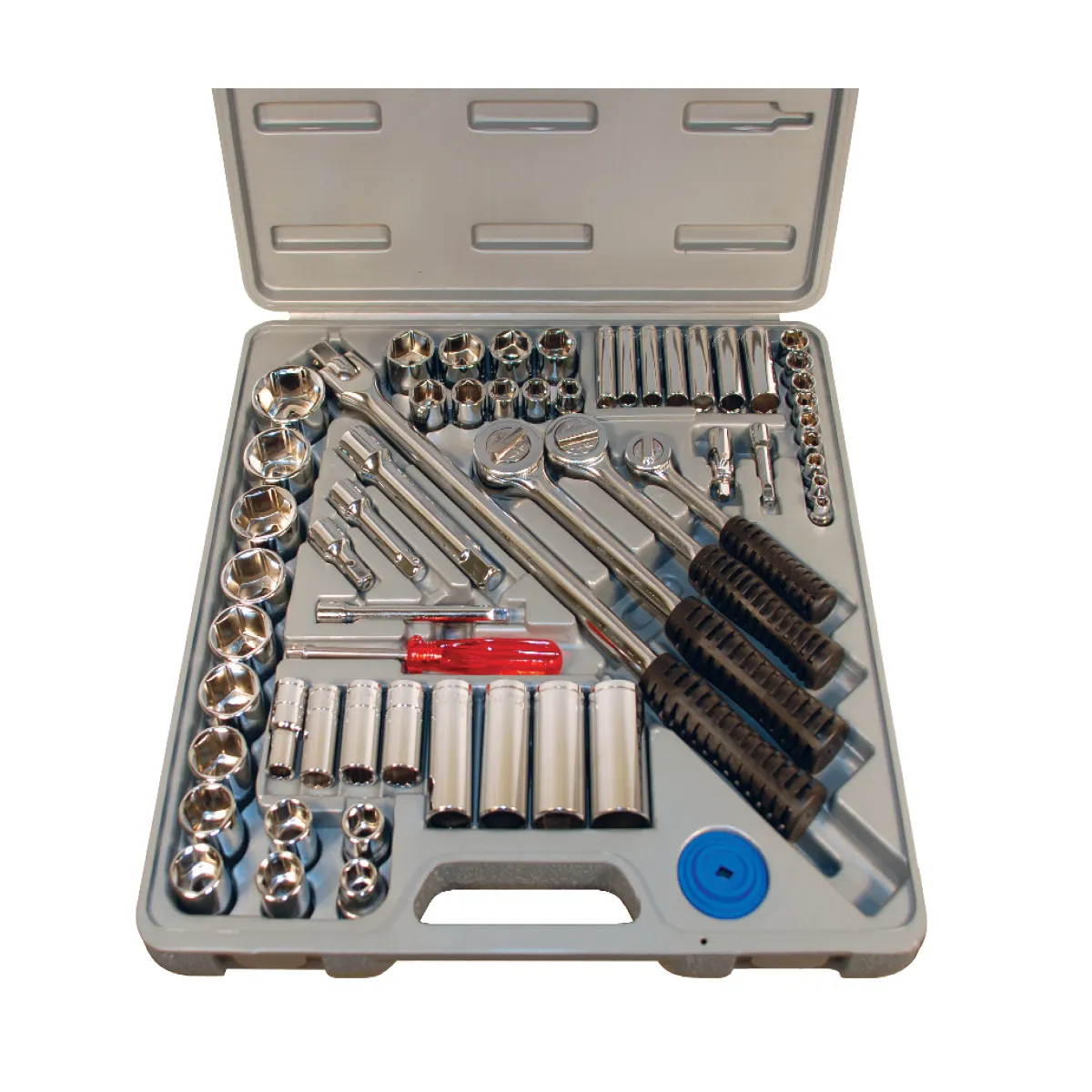 - Contains: (1) 1/4in drive x 5in Reversible ratchet handle with built-in speed disc | (1) 3/8in Drive x 8in Reversible ratchet handle with built-in speed disc | (1) 1/2in Drive x 10in Reversible ratchet handle with built-in speed disc | (1) 1/2in Drive x 17in Flex Breaker Bar | (9) 1/4in Drive 6-Point Sockets | (7) 1/4in Drive Deep Wall 6-Point Sockets | (9) 3/8in Drive 6-Point Sockets | (8) 3/8in Drive Deep Wall 6-Point Sockets | (13) 1/2in Drive 6-Point Sockets | (3) Speed Disc Set | (2) 1/4in Drive Extension Bars 2in and 4in Length | (2) 3/8in Drive Extension Bars: 1-3/4in and 3in Length | (1) 1/2in Drive x 5in Extension Bar | (1) 1/4in Drive x 6in Spinner Handle | (1) 1/4in Drive Universal Joint.
