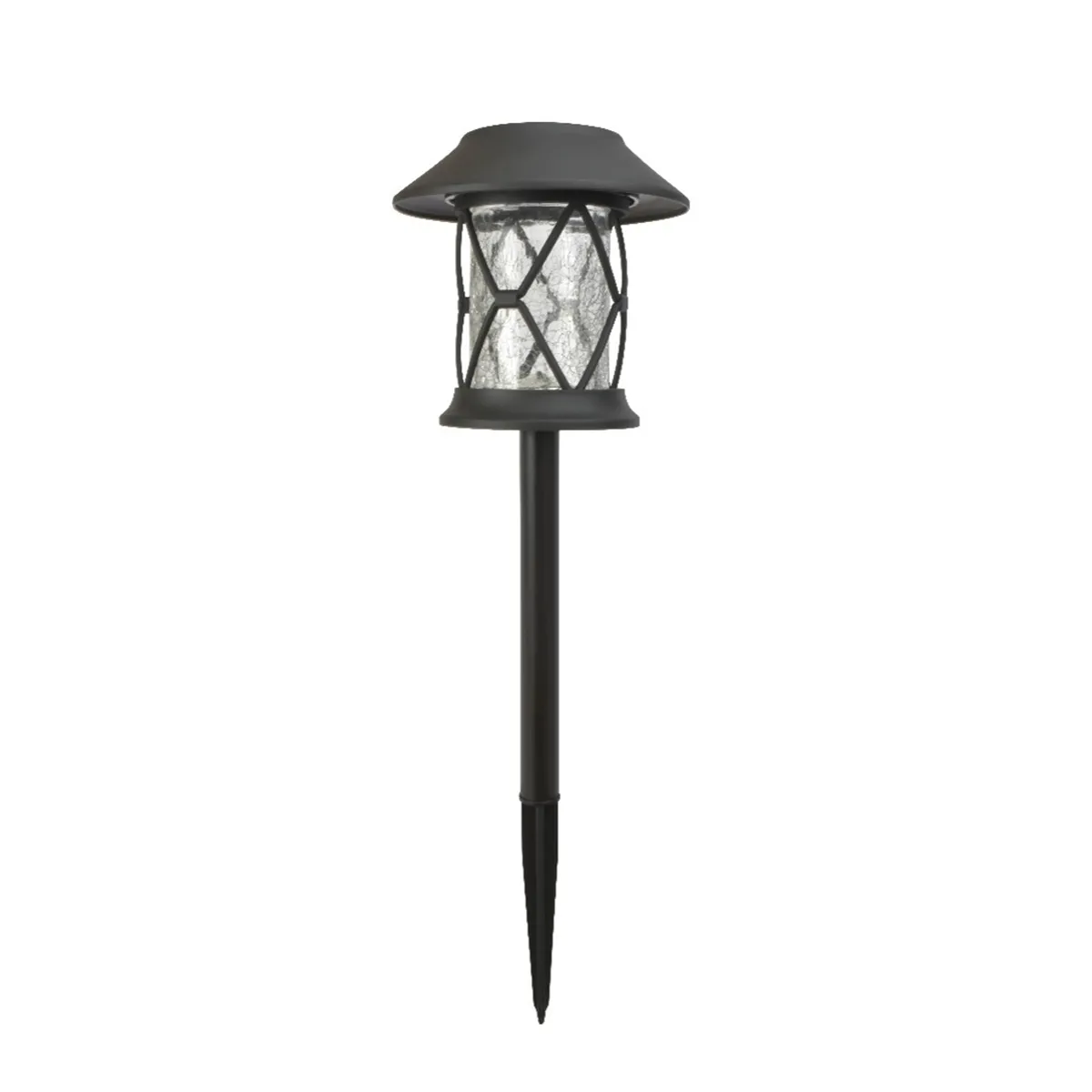 2 pack solar lantern style crackle glass stake lights metal; plastic and crackle glass black colour polycrystalline solar panel 1 x warm white smd (12 lumens) 1 x aa - rechargeable ni-mh battery run time up to 8 hours on a full charge dimensions - 6. 70 diameter x 21. 65in height packaging in full colour box.