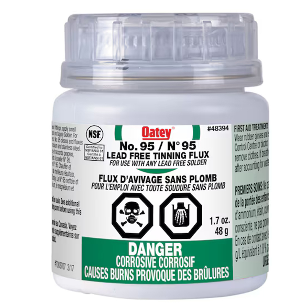 Oatey® No. 95 tinning flux is a petrolatum-based flux containing solder powder to aid in soldering process. It cleans; tins and fluxes most commonly soldered metals. Excellent for large diameter copper pipe. 100% Lead free. Tinning powder helps to pre-tin pipe. NSF listed for potable water applications. Oatey products have earned the trust of plumbing professional for over 100 years. Made in the USA.