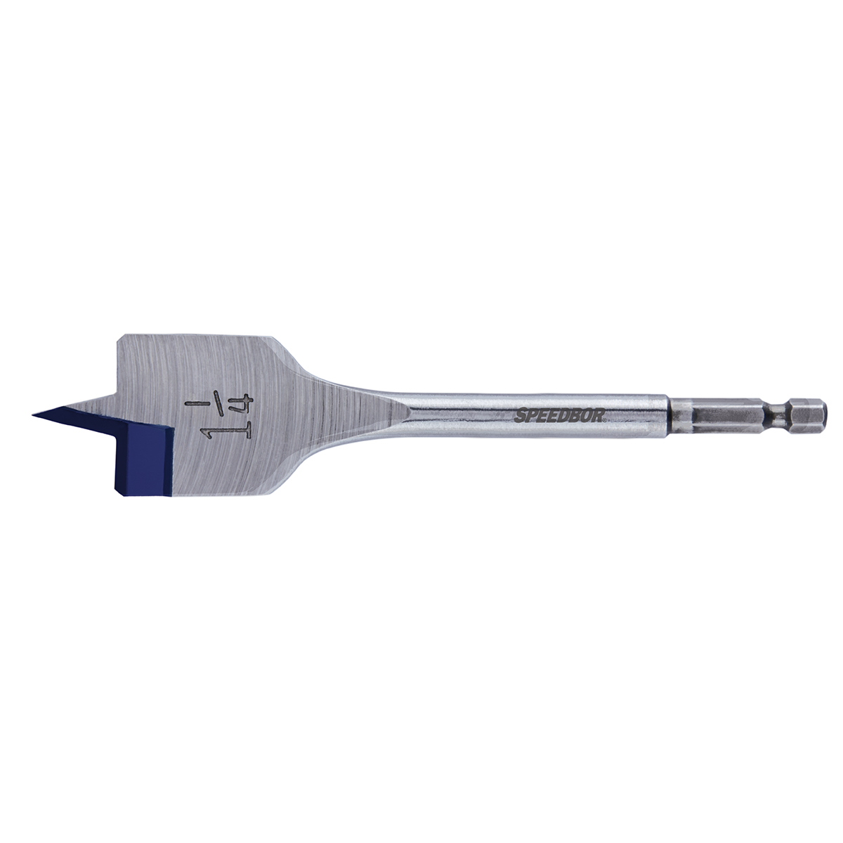 Blue-groove point and cutting edge for faster chip removal 4x faster than standard spade bits. double cutting spurs scribe the outside of the hole; reducing breakout. 10% Larger shank for added durability. Grooved hex shank prevents slipping in drill chuck or bit extension. Fits all standard quick change chucks.