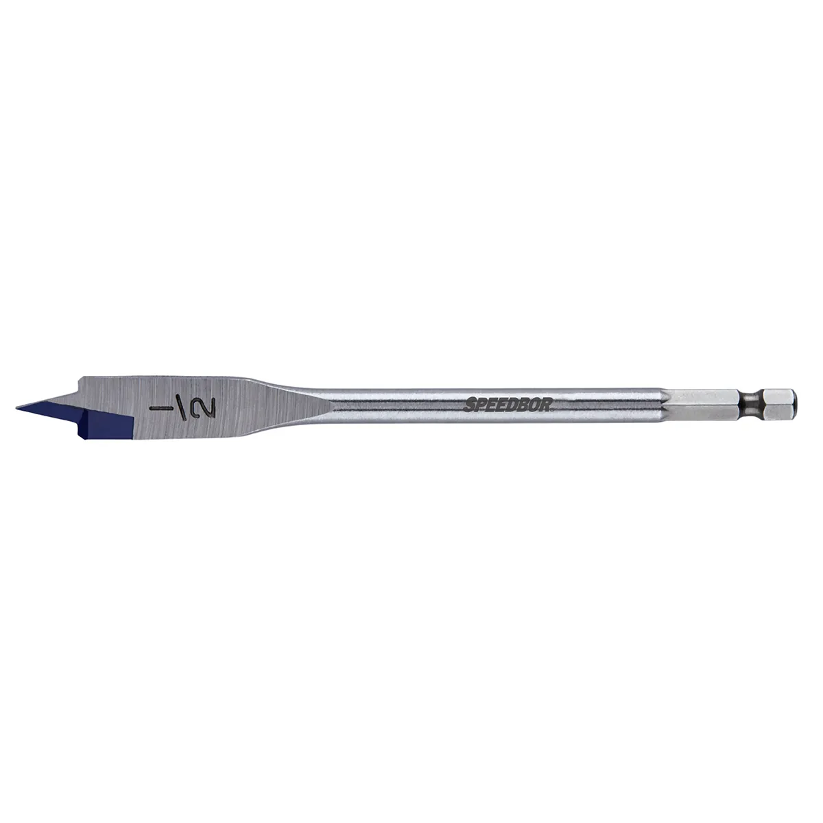 Blue-groove point and cutting edge for faster chip removal 4x faster than standard spade bits. double cutting spurs scribe the outside of the hole; reducing breakout. 10% Larger shank for added durability. Grooved hex shank prevents slipping in drill chuck or bit extension. Fits all standard quick change chucks.