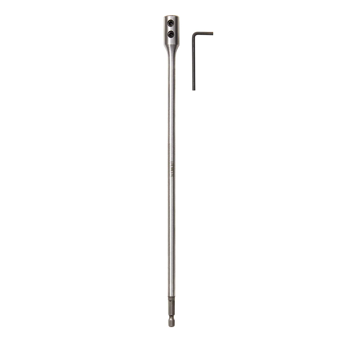 Spade drill bit extension 12in. For all wood bits with 1/4in round shanks; three flats on shank. Follows 5/8in and larger bits through hole. Heavy-duty; double set screw type; adds to regular bit lengths. Forged of finest quality tool steel. Allen wrench included.