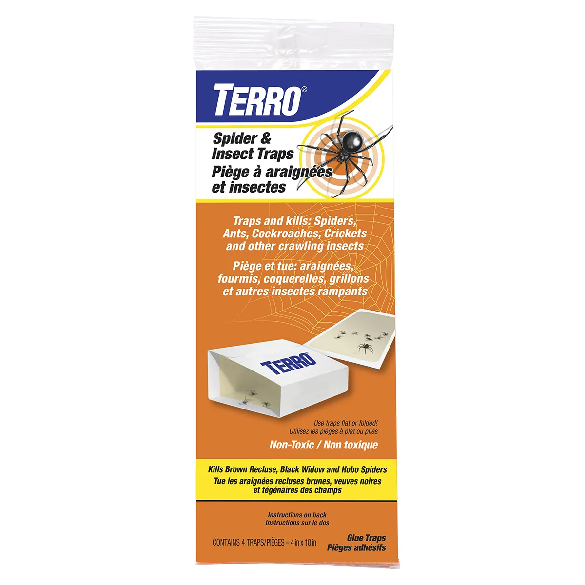 - black widow, hobo spider and brown recluse - with TERRO Spider & Insect Traps. Each package includes four ready-to-use glue traps. The spider traps can be folded to prevent children and pets from coming in contact with the non-toxic sticky surface, or they may be used unfolded to lie flat. TERRO Spider & Insect Traps are an excellent way to capture and kill a large number of spiders and other crawling insects. Pesticide free and easy-to-use, spiders, scorpions, ants, cockroaches, crickets and other crawling insects are captured by the trap’s sticky surface where they get stuck and die. For best results, replace the spider traps every three months or when the trap becomes full of spiders and insects.
