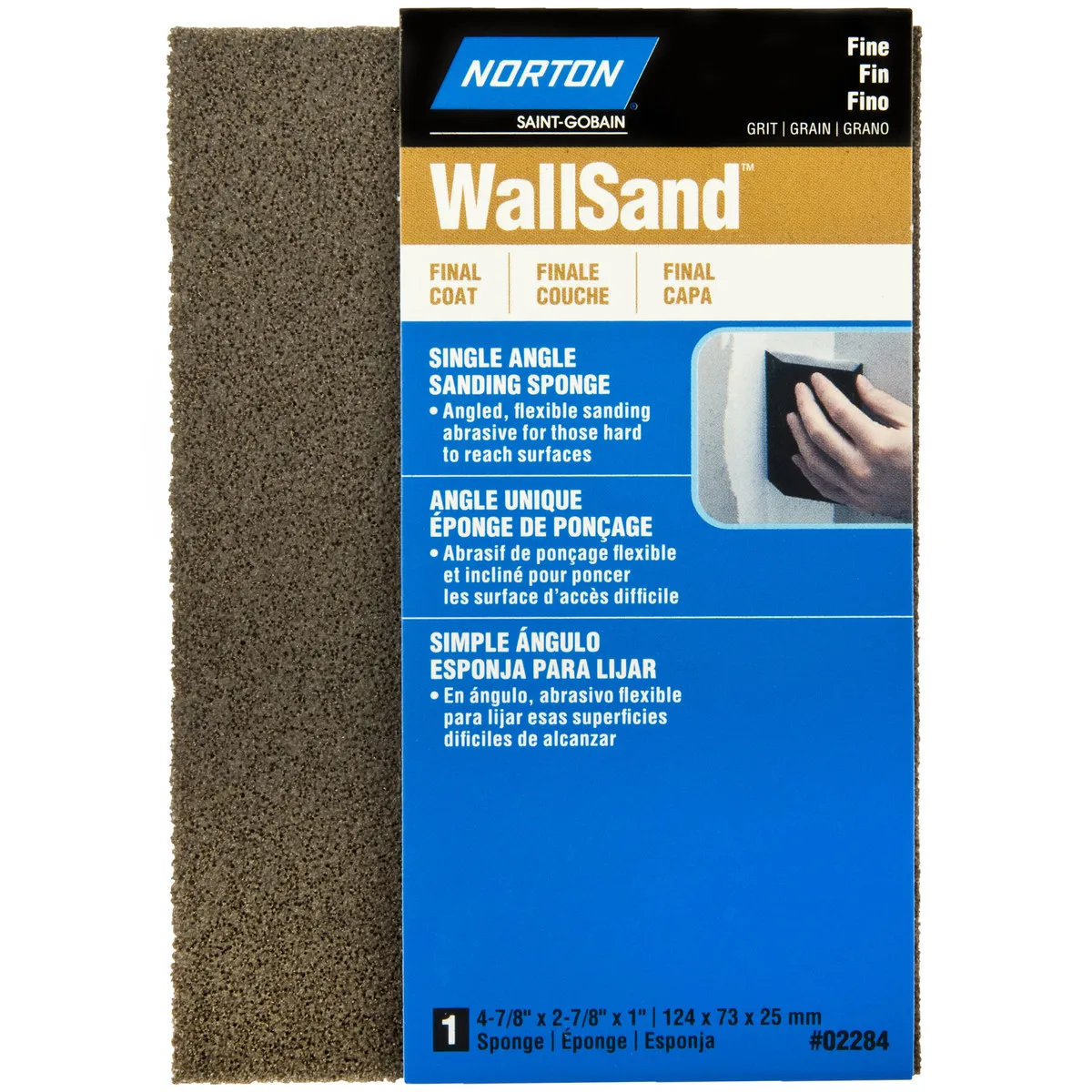 WallSand™ Fine 2-7/8 in x 4-7/8 in 120 grit single angle sanding sponge (02284) by Norton®. Width: 2-7/8in; length: 4-7/8in. Grade type fine; grit size: P120. Flexible abrasive-coated foam for sanding curved; contoured or flat surfaces of wood; metal; paint; plastic; ceramics and drywall. If you're looking for a quality product that will serve you for years to come; look no further.