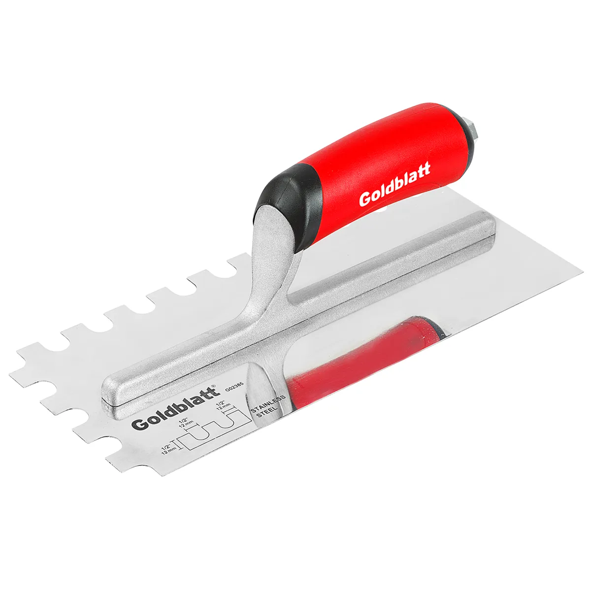 Mirror polished non-rust stainless steel trowel blade aluminum alloy mounting is very strong but light weight anti-turn ergonomic soft grip handle reduces fatigue blade measures 11 in x 4-1/2 in available in a variety of notch styles.