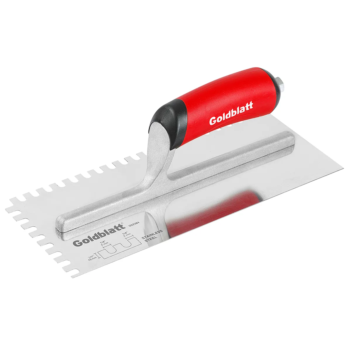 Mirror polished non-rust stainless steel trowel blade aluminum alloy mounting is very strong but light weight anti-turn ergonomic soft grip handle reduces fatigue blade measures 11 in x 4-1/2 in available in a variety of notch styles.