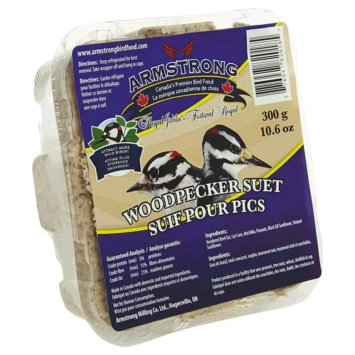 Armstrong Woodpecker Suet is a high-quality suet designed specifically to attract woodpeckers and other birds. It is made with a blend of ingredients such as rendered beef fat, peanuts, black oil sunflower, and other grains and seeds. This suet is best used with a wire suet cage or hopper feeder and is particularly effective during colder weather months. It can attract a variety of birds, including Downy Woodpeckers, Hairy Woodpeckers, Red-bellied Woodpeckers, and Black-capped Chickadees.