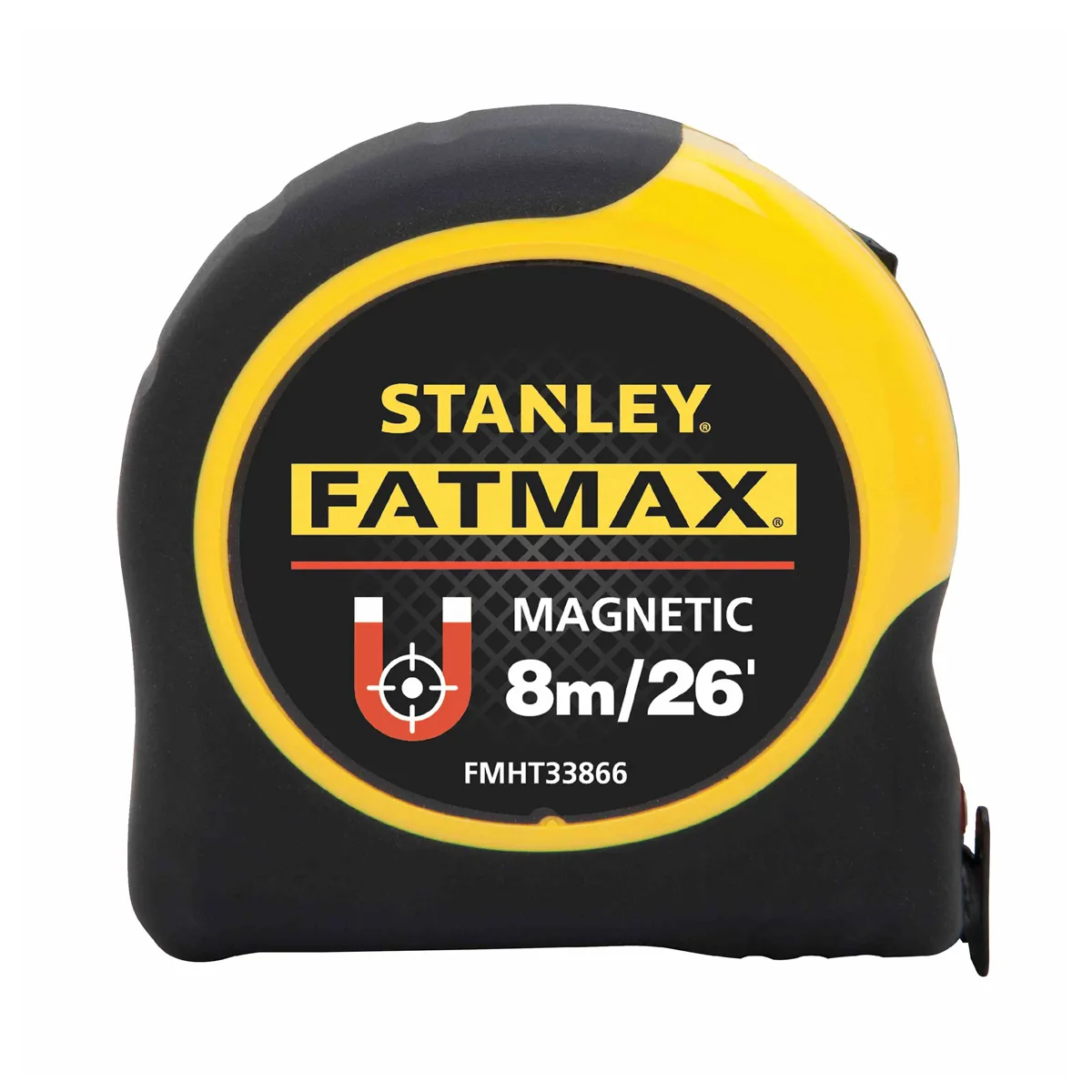 The STANLEY® 8m/26ft FATMAX® Magnetic Tape Measure fits your toolbelt; your hand; and the job. 14ft of reach and a durable high impact case make this tape dependable on any job site. Protective full tape blade coating and added Blade Armor® at the hook extends tape life against abrasion and heavy use. Large; easy to read numbers and standard stud markers assure accuracy.