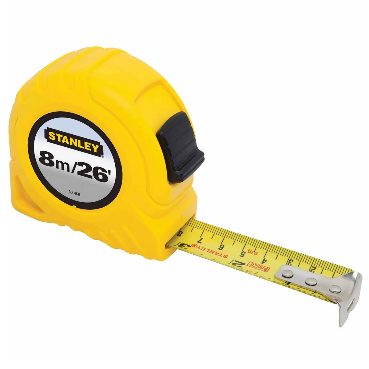 The STANLEY® 8m/26ft tape measure case is made from quality high impact ABS for durability. The blade featuring both meters andft is polymer coated to withstand abrasion. Stud markings are visible at 16in and 19.2in.