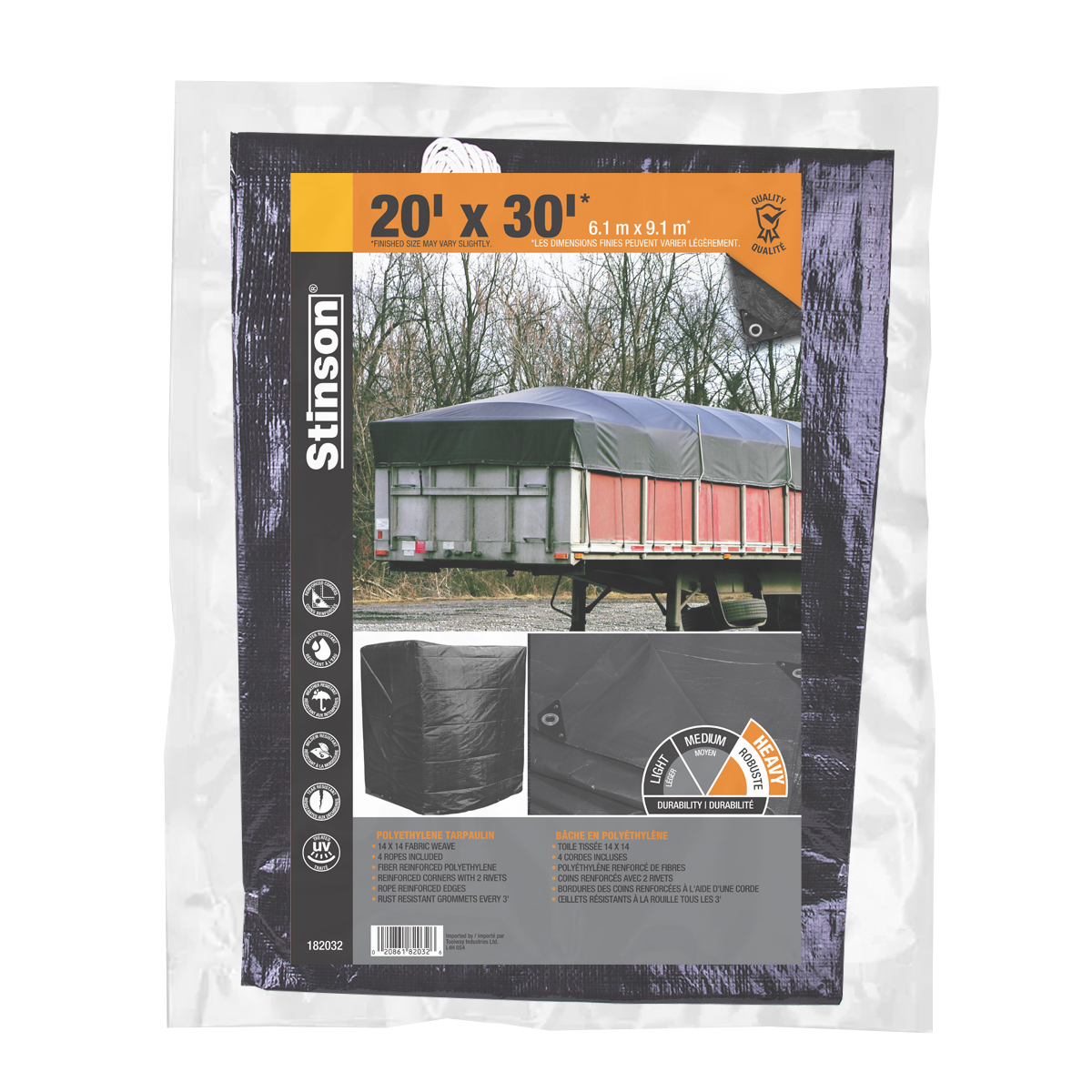 Stinson® tarpaulins from Toolway are the perfect choice for all your covering needs. These heavy-duty black tarps are stronger than canvas and offer full weather protection. Their UV treated fiber and rope reinforced construction make them tear resistant and less prone to fraying. The double riveted corners provide additional strength. Rust resistant grommets are located every 3 feet for secure fastening. Each tarp includes 4 tie-down ropes for added convenience.