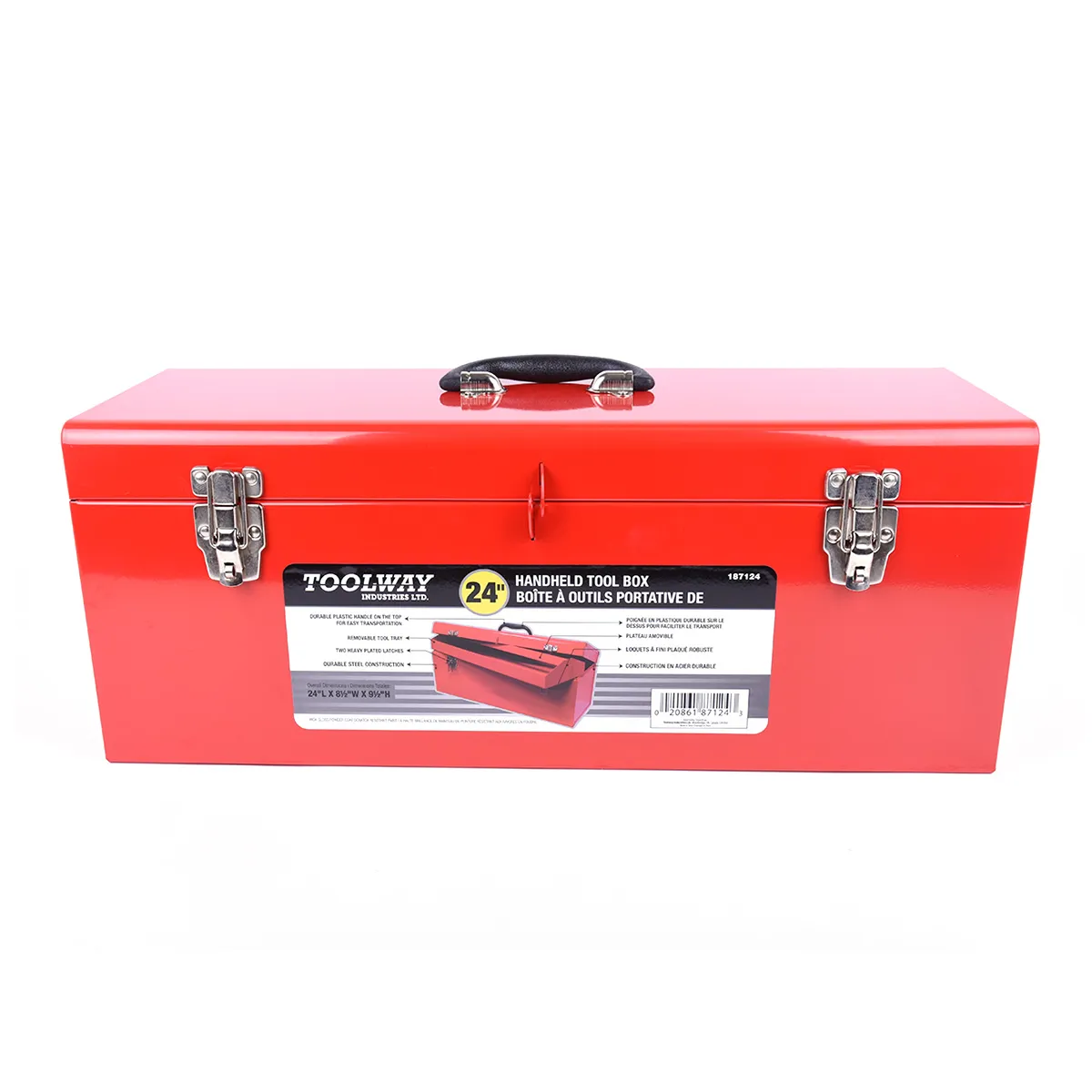 Heavy duty 24in steel toolbox with 1 tray; weight capacity 55 lbs; durable plastic handle on top for easy transportation.