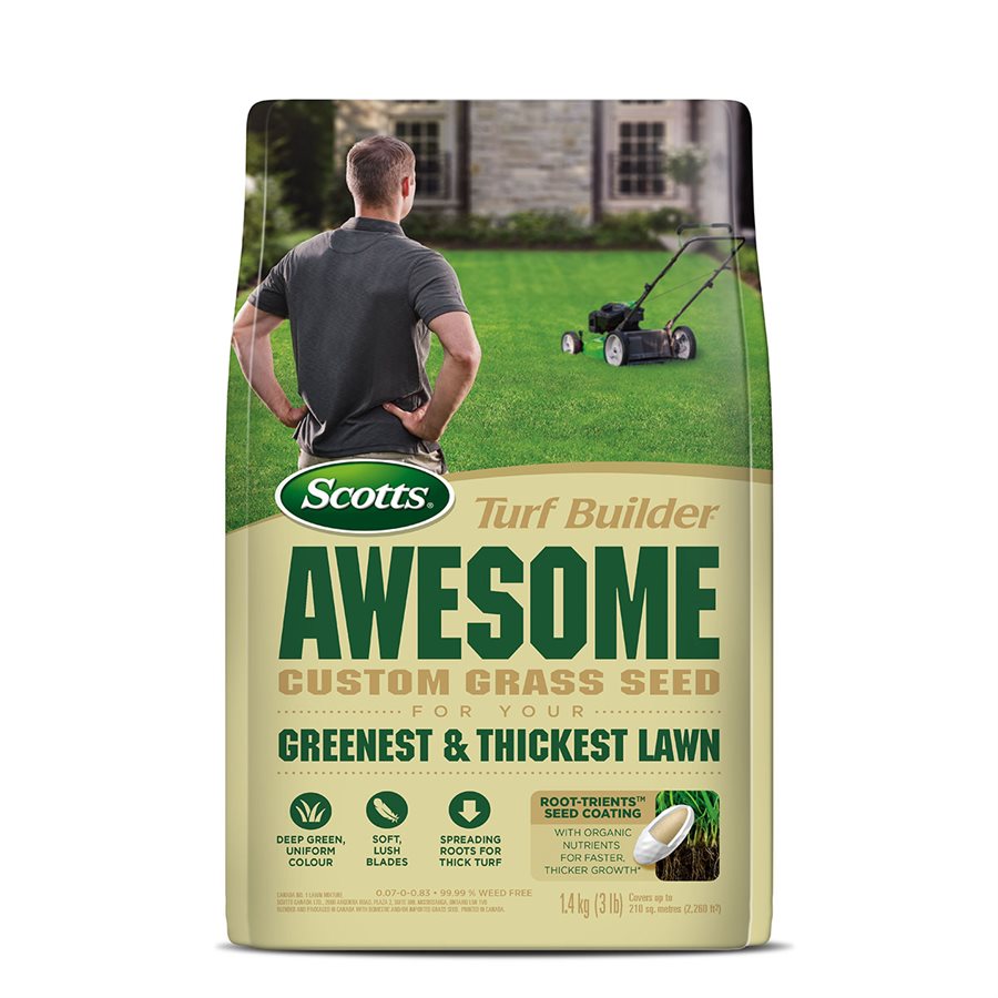 Every lawn has a secret desire to become its own kind of lush; green; and awesome. Help your lawn achieve awesome-ness with Scotts® Turf Builder® AWESOME custom grass seed 1.0-0-0.3. Dense; dark green Kentucky bluegrass seed is the main grass type in this unique seed ; which also includes fine fescue and fast-germinating perennial ryegrass. Ideal for any homeowner who wants a lawn uniform in color; with soft grass blades; and dense; self-repairing turf. This grass seed is specially coated with ROOT-TRIENTS® to help establish turf grass faster and thicker than uncoated seeds. So; it’s great for seeding your lawn or starting a new one. For your greenest and thickest lawn; use Scotts® Turf Builder® awesome custom grass seed 1.0-0-0.3.