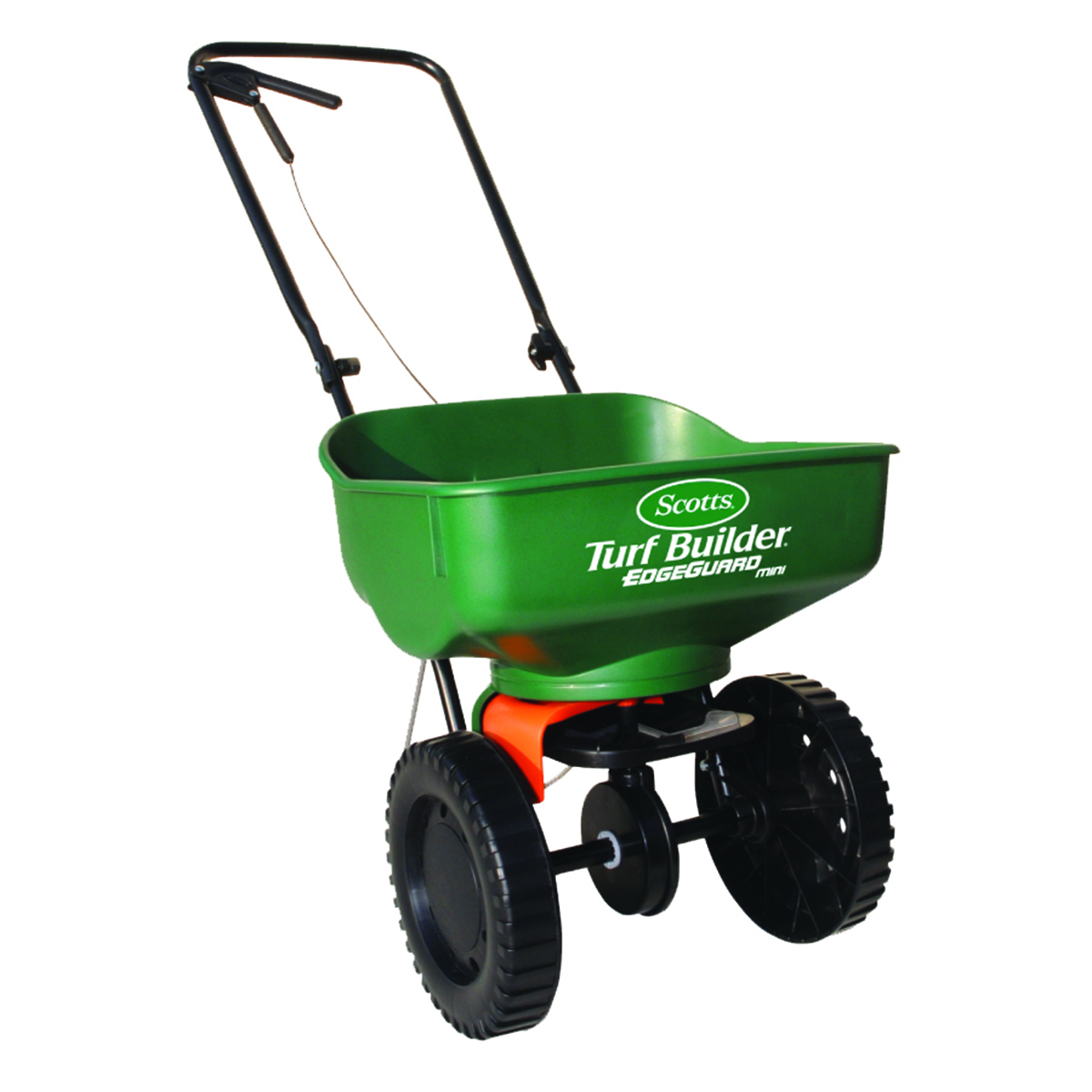 Scotts Turf Builder Mini walk-behind broadcast spreader for Mid-Sized Lawns.